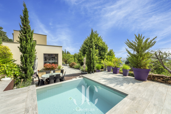Comment ne pas s'exclamer devant une propriété aussi prestigieuse bénéficiant d'une telle vue sur mer ? L'exception est au rendez-vous dans le moindre espace de cette maison de 295m² érigée sur un terrain de 1200m². Idéalement située à seulement quelques minutes à pied des plages, elle bénéficie d'un emplacement privilégié. Dès le portail franchi vous serez séduits par une très élégante allée ornée d'une végétation laissant deviner l'ambiance raffinée de l'ensemble de la propriété. L'espace de vie, jour et nuit, est aménagé de plain pied. La spacieuse entrée vous laissera découvrir une magnifique pièce de réception de 70m² donnant le privilège d'une vue exceptionnelle sur mer. Cet espace particulièrement lumineux car traversant et bordé de larges baies vitrées, permet de profiter d'une magnifique terrasse avec piscine à débordement et d'un charmant patio. L'esprit "dedans/dehors" prend alors tout son sens. En lien avec cette pièce, vous profiterez d'une très spacieuse cuisine avec espace dinatoire. De là, vous pourrez bénéficier d'un accès à une seconde terrasse protégée donnant ainsi à l'ensmble un esprit de cuisine d'été. Une arrière cuisine tient lieu d'office et buanderie. La partie nuit, de plain pied également, n'est pas en reste dans le raffinement et propose une Master Suite avec accès direct à l'extérieur et toujours la vue imprenable sur la méditerranée. Deux autres chambres équipées en Suites, bénéficiant chacune d'une salle d'eau privative vous sont proposées. Les suprises ne s'arrêtent pas là, car en niveau inférieur, vous entrerez dans un autre univers, mais tout aussi raffiné. Tout d'abord un bureau et un très large dressing, l'ensemble pouvant être aménagé en Suite. Puis vient l'espace étonnant avec une magnifique salle de jeux aménagée avec un bar équipé. Pour compléter cet espace détente, une très élégante cave à vins. Un autre espace contigu et d'une surface de 70m² est prêt à être aménagé. Garage double, terrain de pétanque complètent cette fabuleuse propriété. Un lieu rare de raffinement, de bien être et de confort à découvrir sans tarder !! Un ambiance incroyable de jour comme de nuit vous attendent pour profiter de moments d'exception dans un cadre unique.
