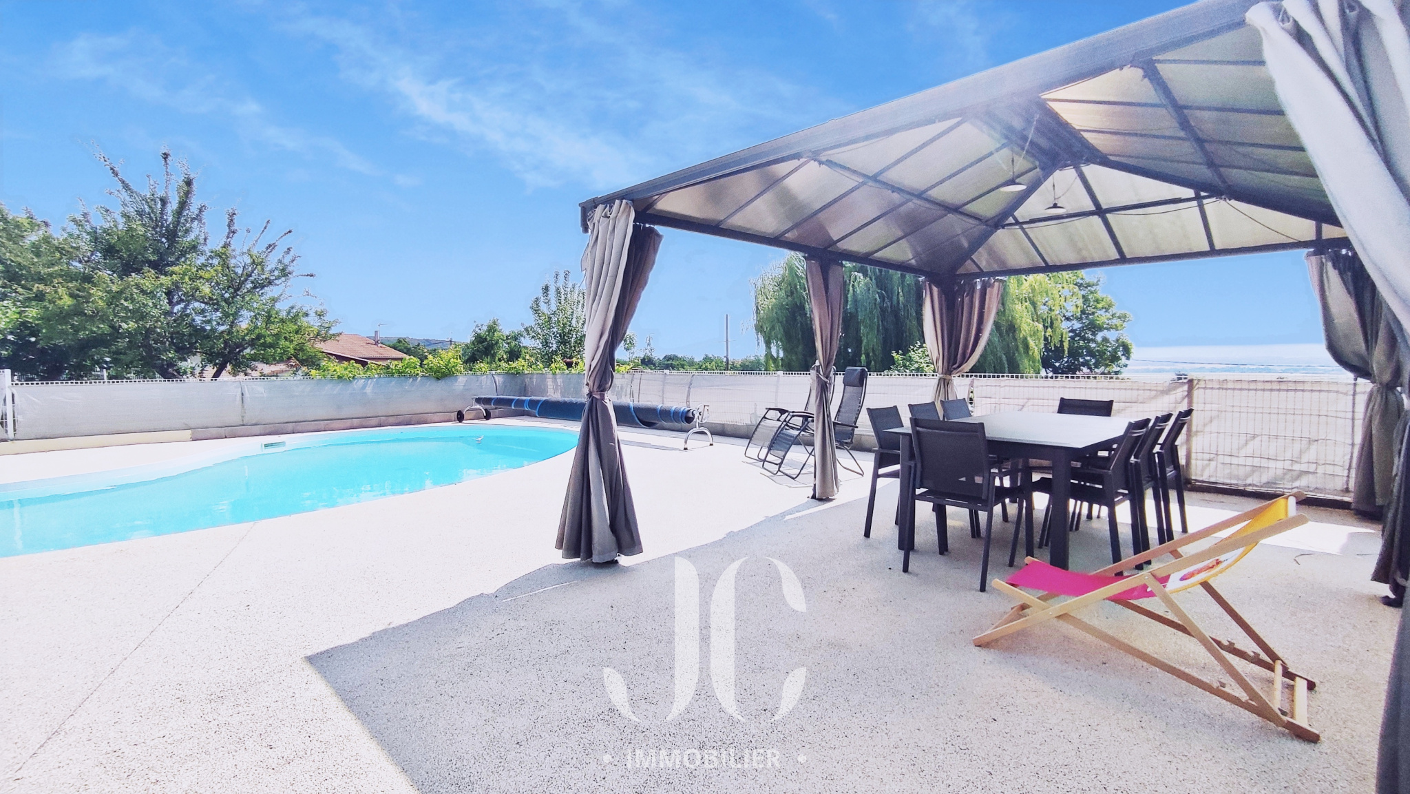 À l’extérieur, le parc joliment arboré et entièrement clos invite à profiter pleinement des beaux jours : piscine sécurisée et facile d’entretien, terrasses conviviales, cadre naturel paisible, avec une belle vue sur le Vercors.