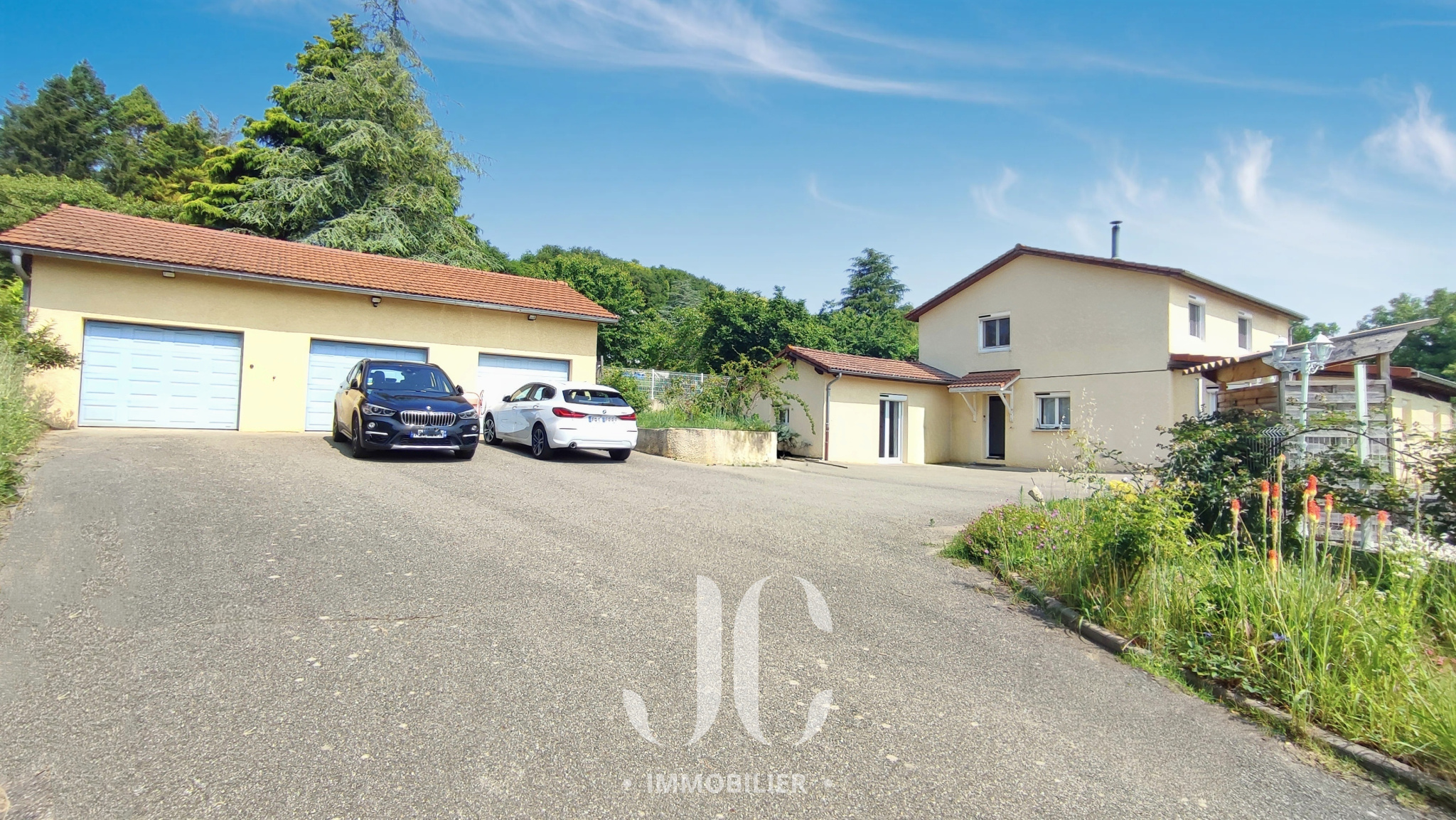 Les prestations extérieures et annexes complètent l’ensemble : grand double garage avec mezzanine, atelier indépendant et box de stockage avec cave, cour enrobée avec portail motorisé.
