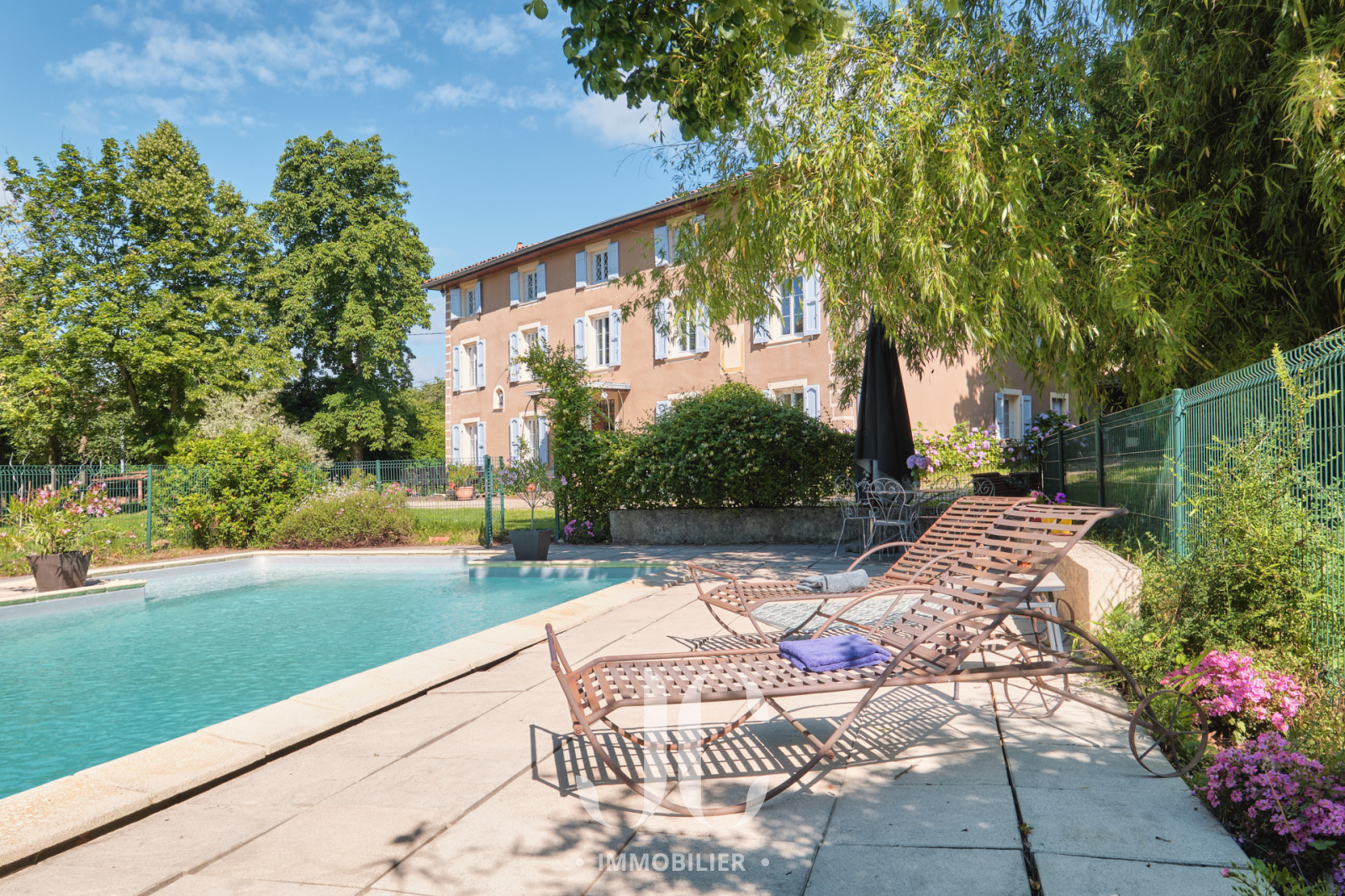 À l’extérieur, le parc arboré invite au calme et à la détente. La piscine traditionnelle, accompagnée de son espace d’été, s’intègre harmonieusement dans cet écrin de verdure, idéal pour profiter des beaux jours en toute intimité.