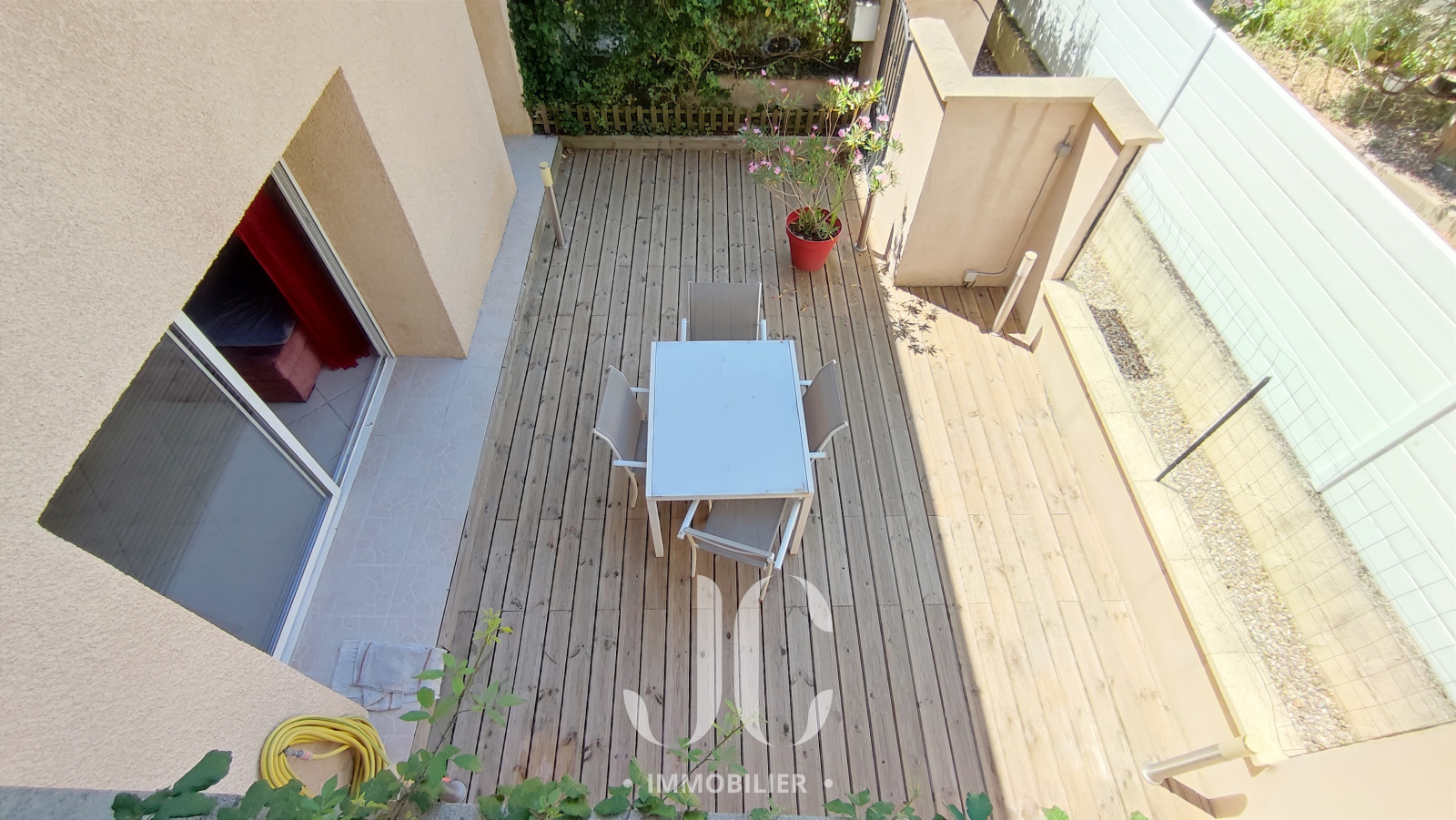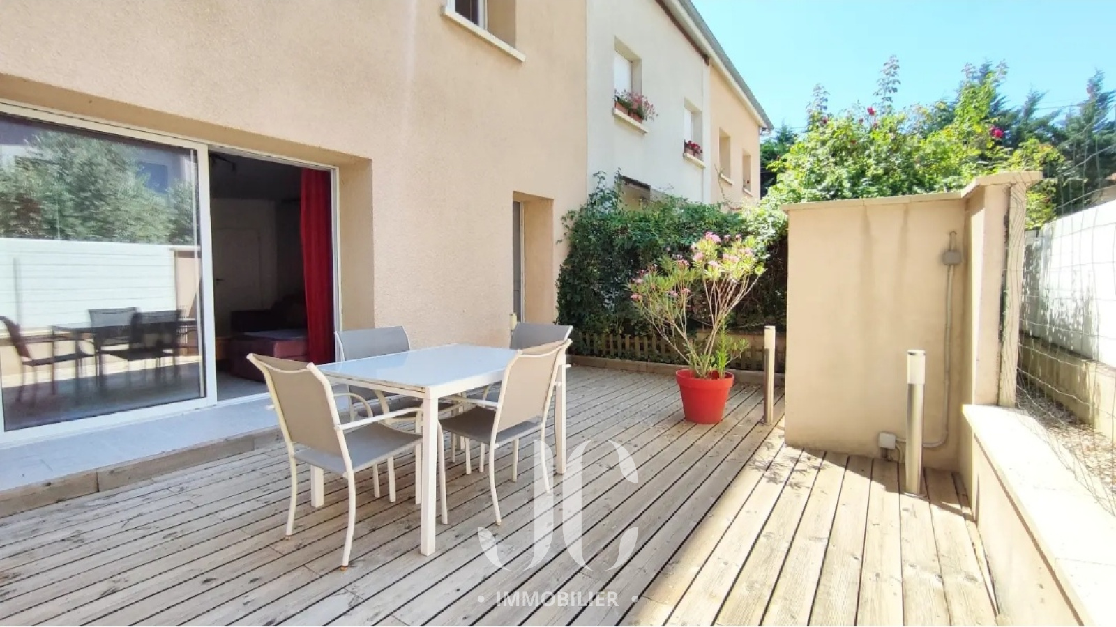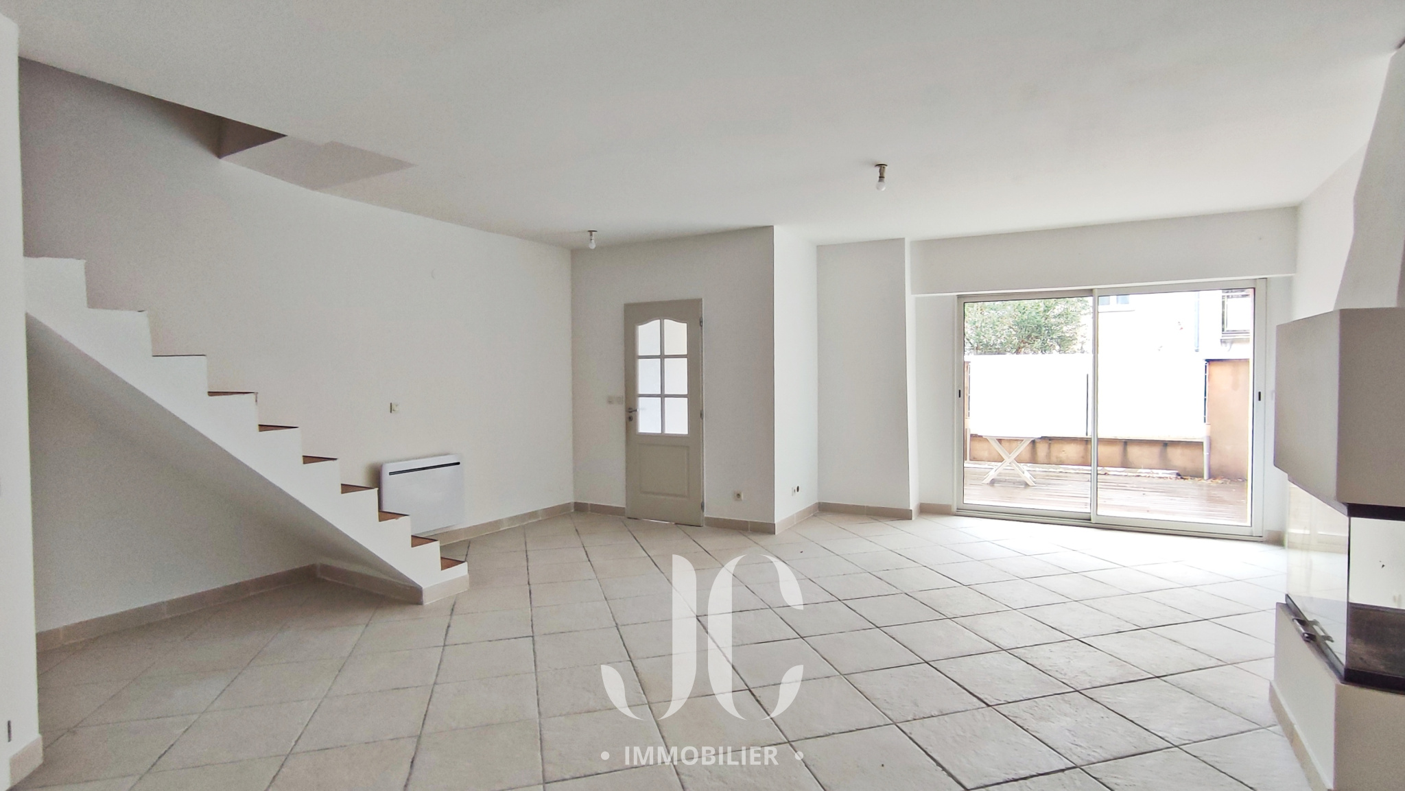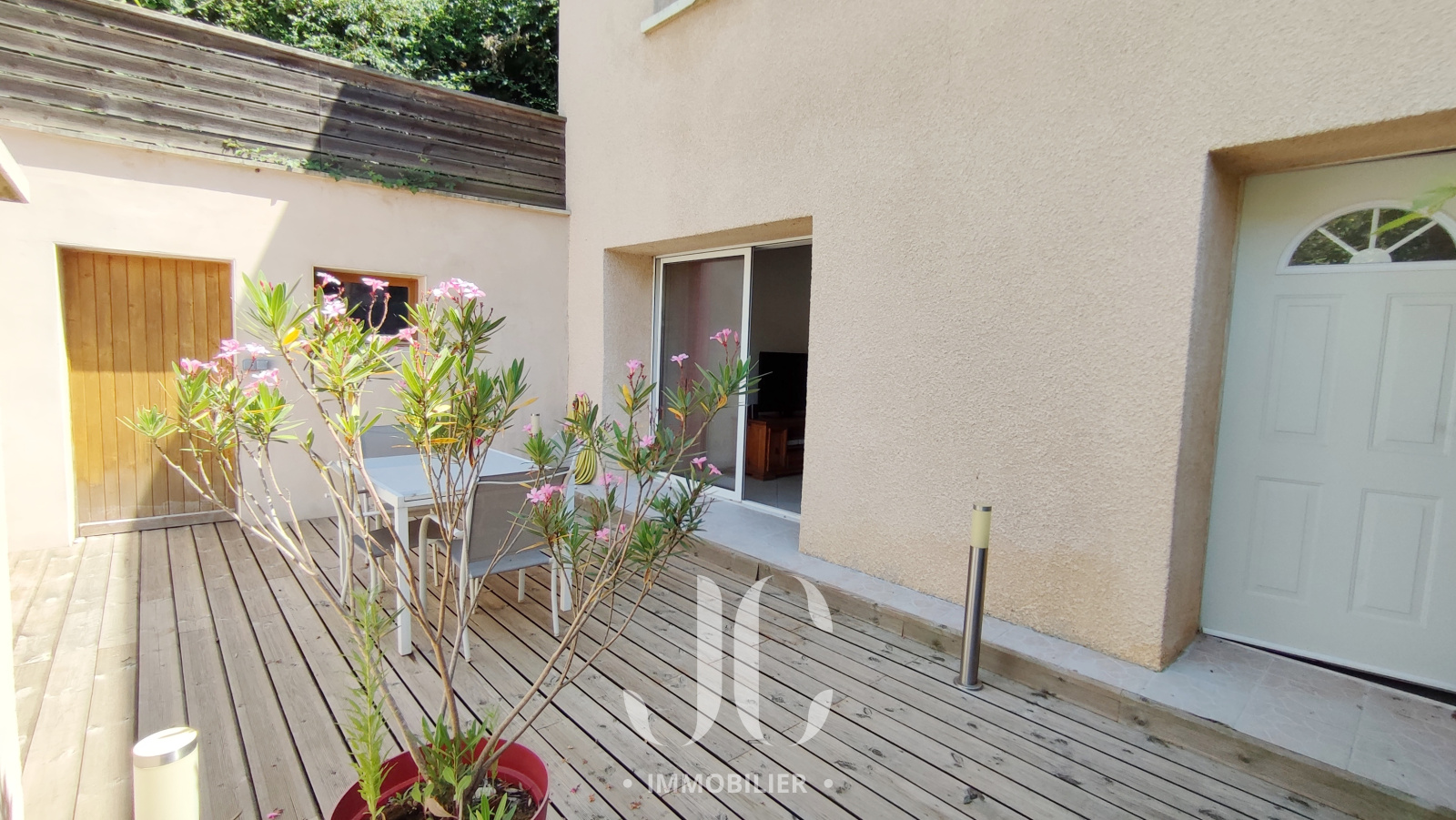 Au rez de chaussée une pièce à vivre vous donne accès à la terrasse exposée sud-ouest devant la maison ou se trouve également un local vélo.