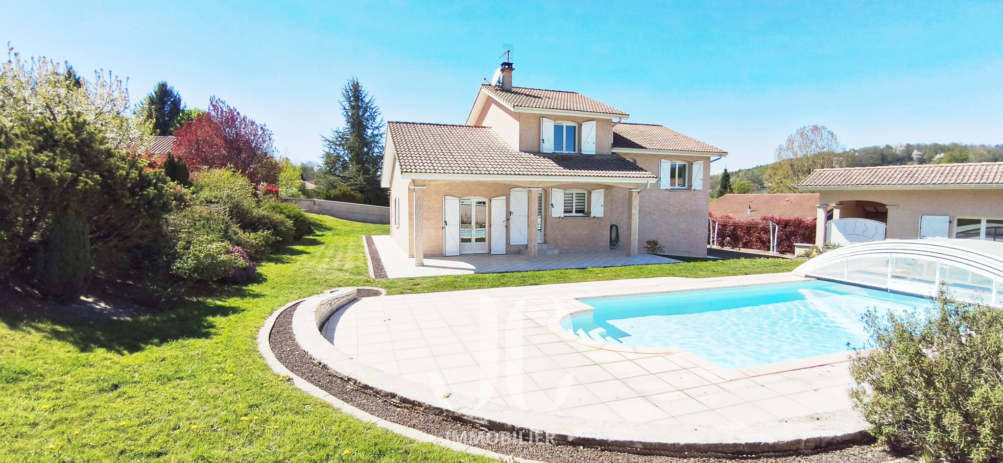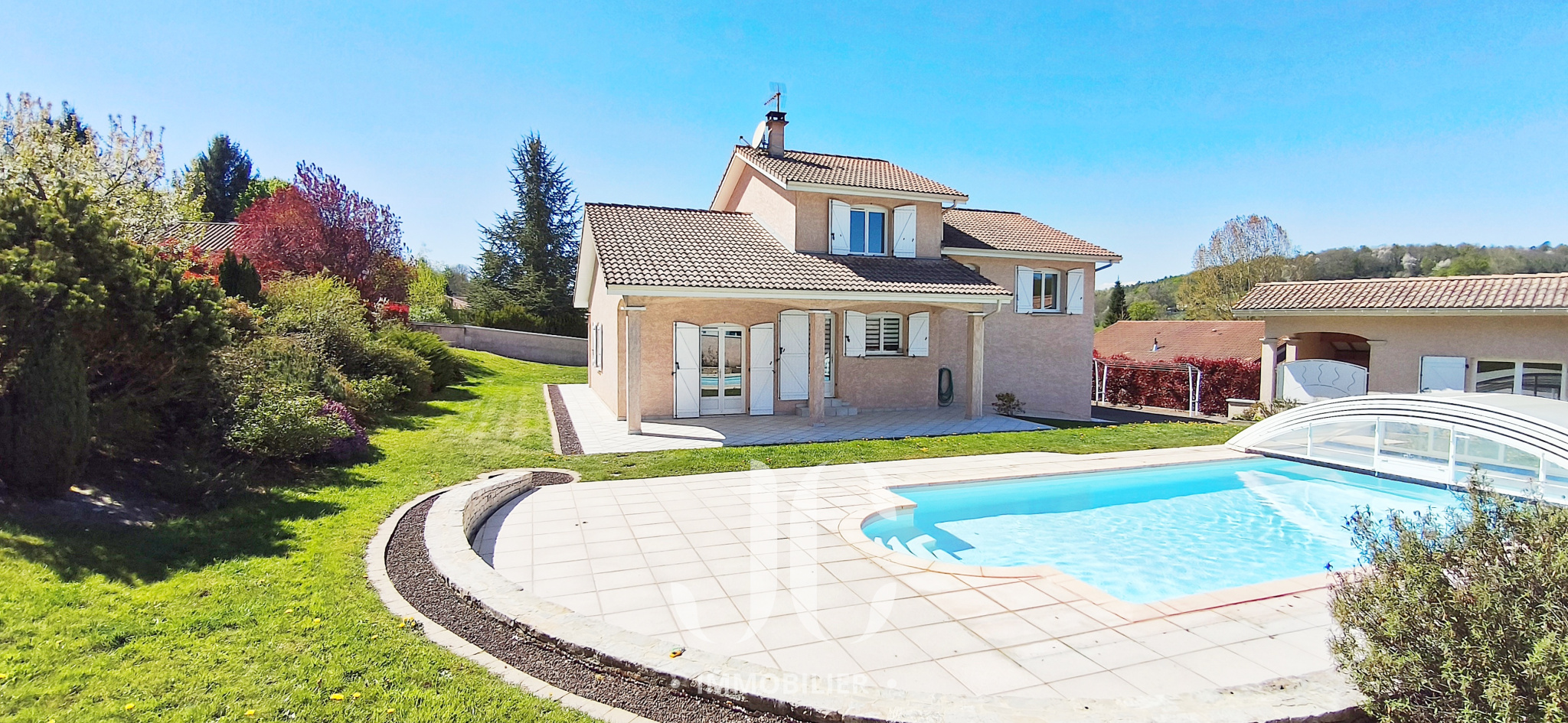 Dans le jardin, la piscine traditionnelle est protégée sous son dôme, ce qui permet de prolonger la saison de baignade , à l'image de la maison les terrasses autour sont soignées et paysagées.