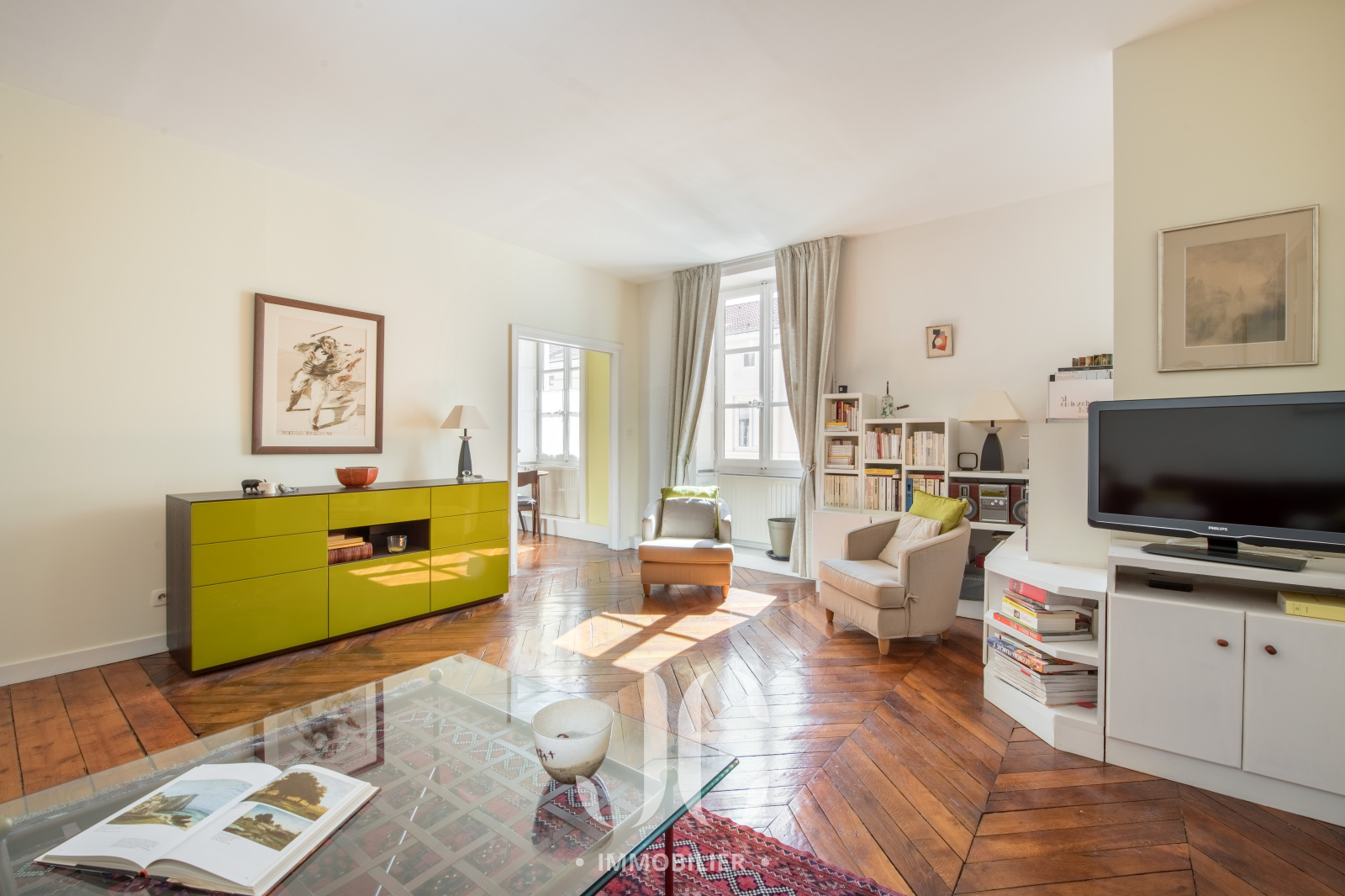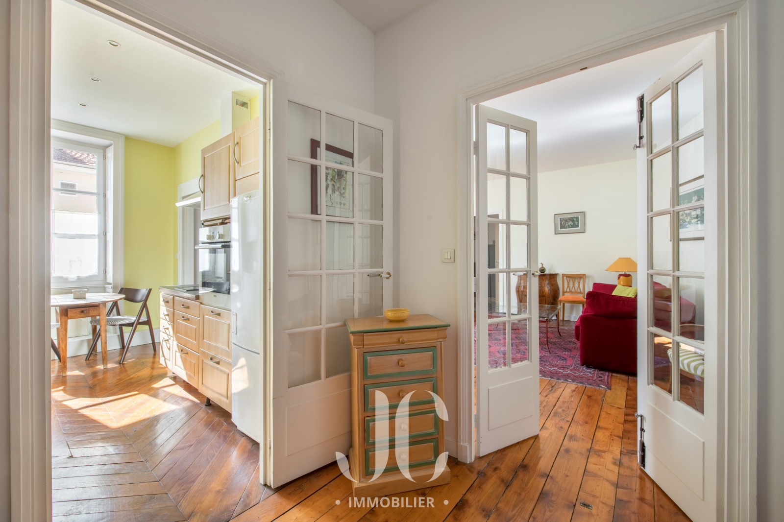 En Exclusivité nous vous proposons cet appartement de charme idéalement situé au coeur de la Presqu'ile et au calme absolu. Au dernier étage d'un immeuble avec ascenseur, ce lieu saura vous charmer par sa tranquilité et le volume de ses pièces. La spacieuse entrée pourra accueillir un espace bureau, et dessert à la fois la cuisne et la pièce de vie. La partie nuit judicieusement séparée de l'espace jour, profite d'une chambre de 16m², d'une salle de bains avec douche et baignoire et d'un espace buanderie. Le bien est complété par un grenier et une cave. Idéalement situé à proximité de toutes les commodités de commerces et transports. A découvrir sans tarder !!!