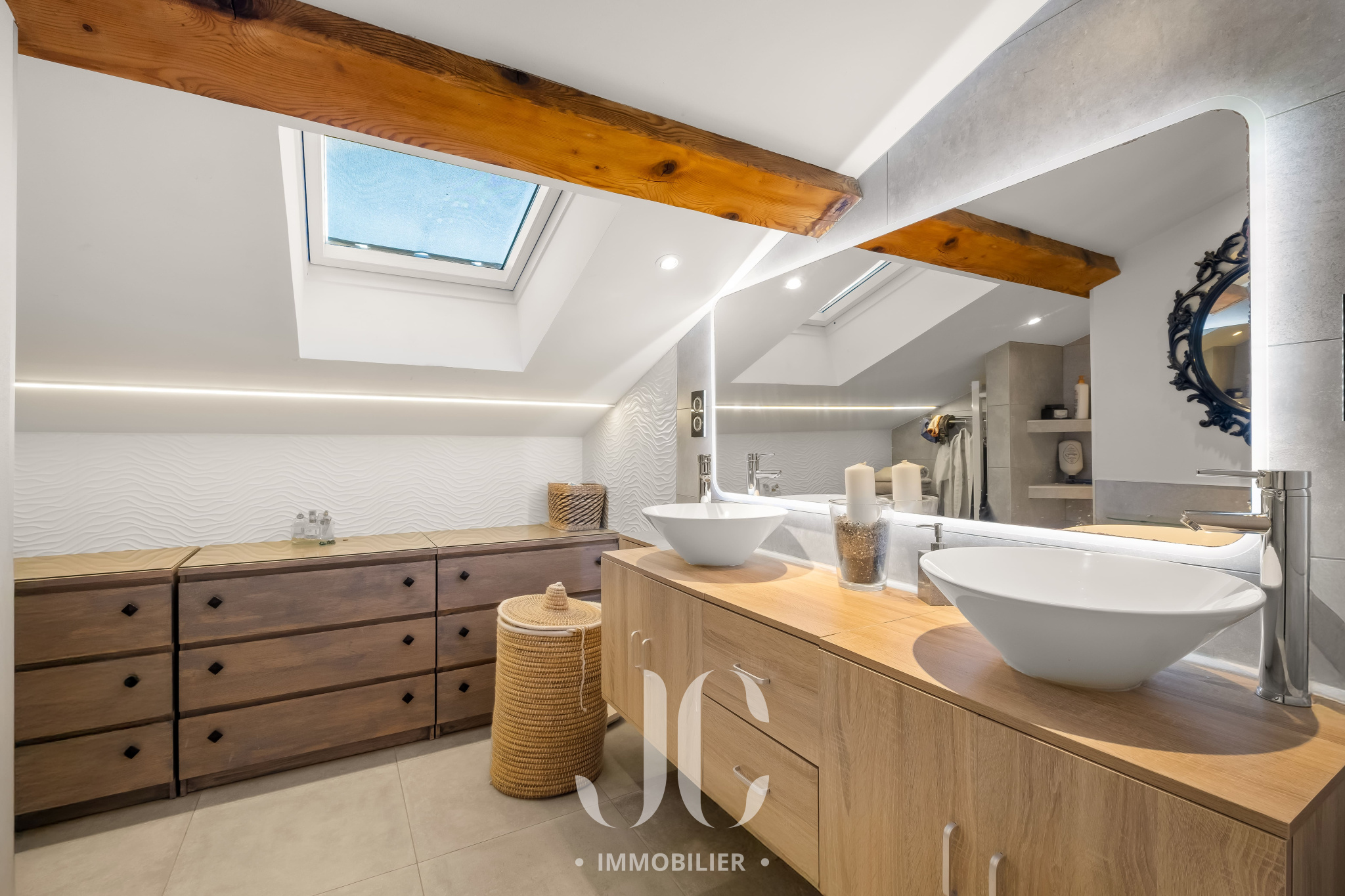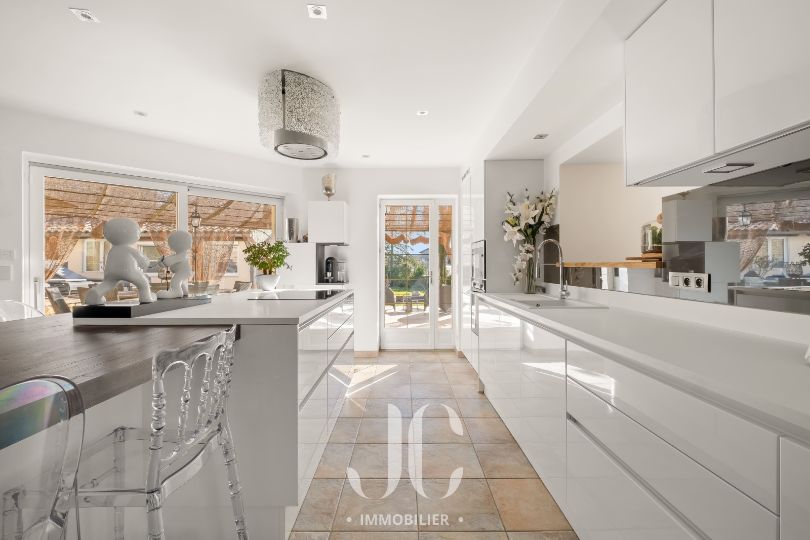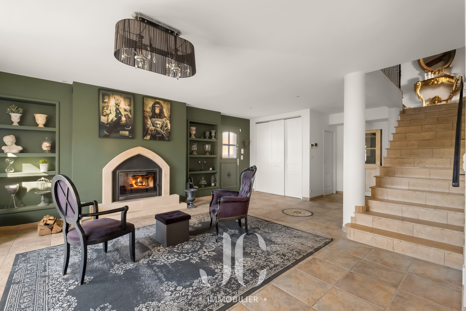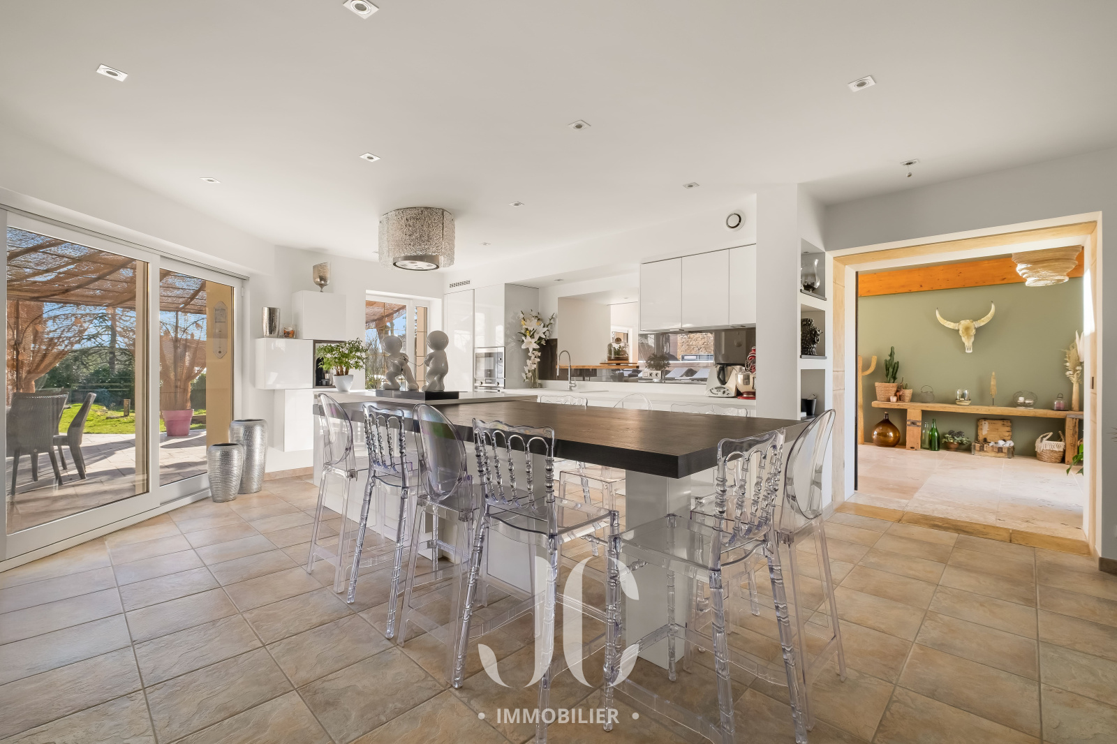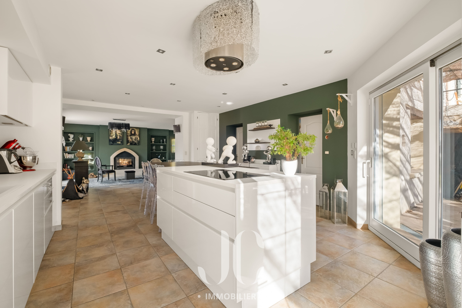 Dès l’entrée, le ton est donné avec un espace chaleureux et accueillant. Une première pièce distribue une cuisine contemporaine aux volumes généreux, pensée comme un véritable lieu de convivialité en s'ouvrant harmonieusement sur un élégant salon agrémenté d’une cheminée, créant une atmosphère raffinée et enveloppante. La circulation naturelle entre les espaces permet de recevoir avec fluidité. Cette atmosphère chaleureuse permettra d'entamer vos soirées en toute simplicité dans une ambiance feutrée et intimiste.