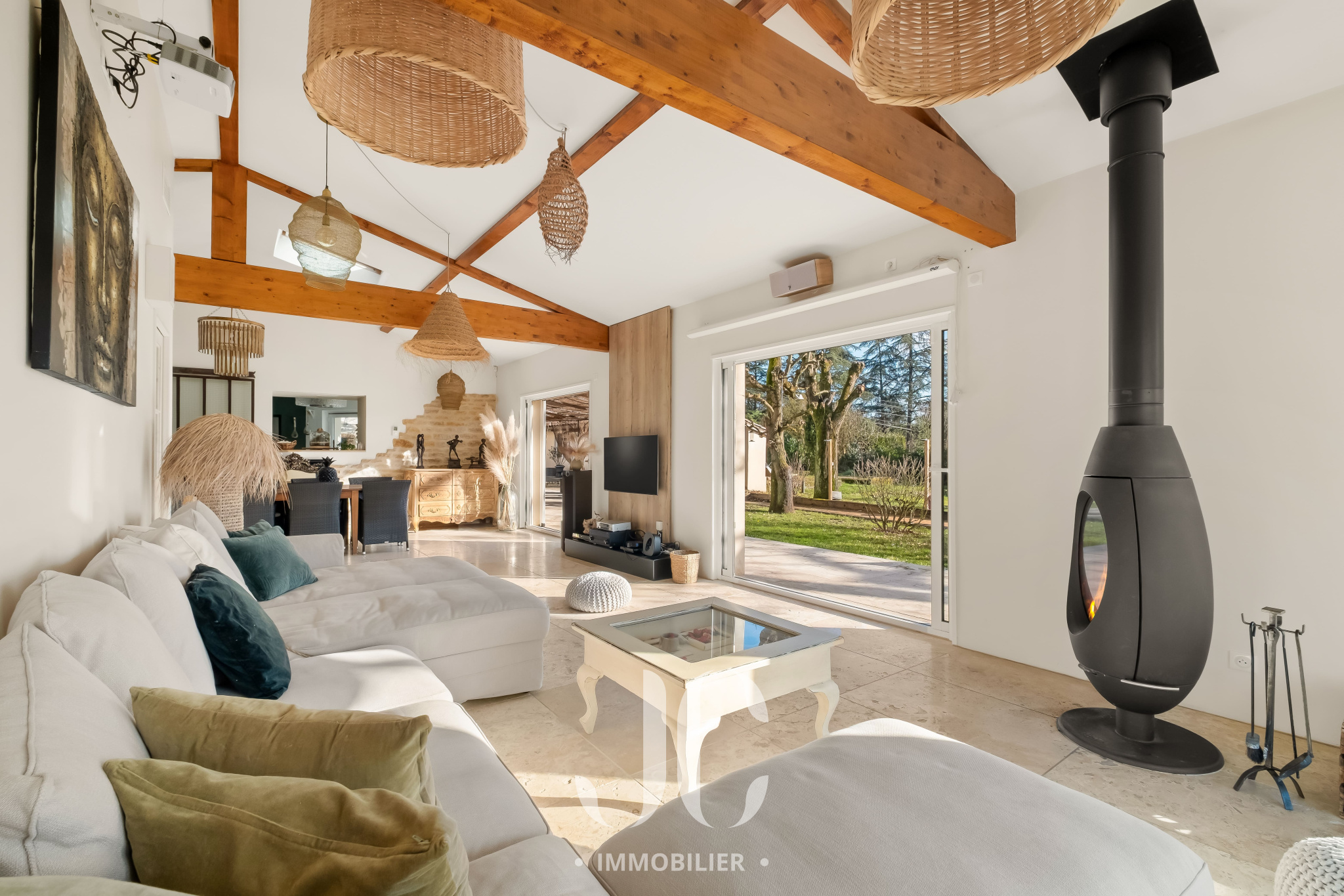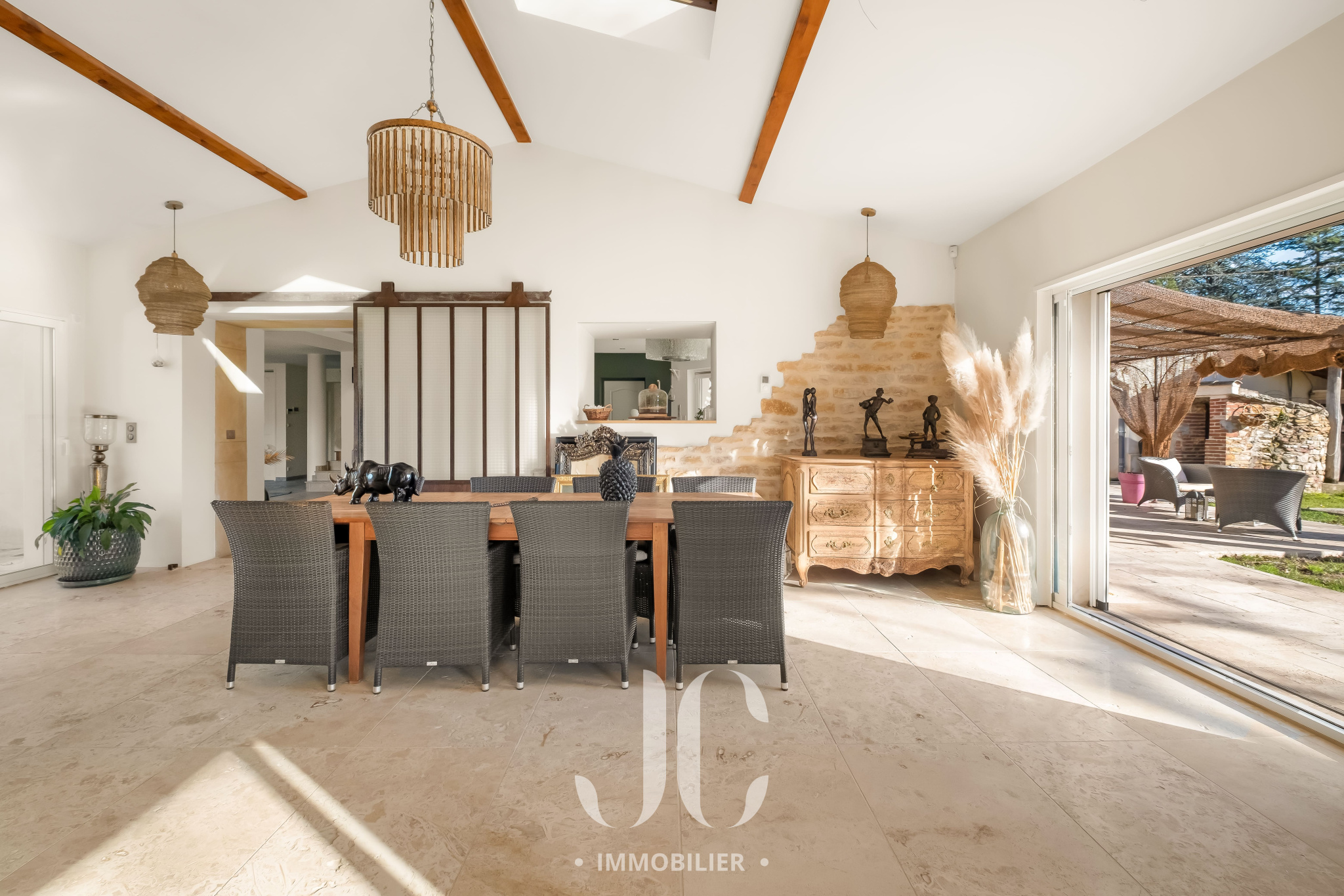Au même niveau une vaste pièce de réception / salle à manger de 60m², baignée de lumière, qui s’ouvre sur l’extérieur et s’étend sur une grande terrasse aménagée avec un brasero pouvant accueillir jusqu’à 10 à 12 personnes, créant un cadre idéal pour des soirées conviviales.