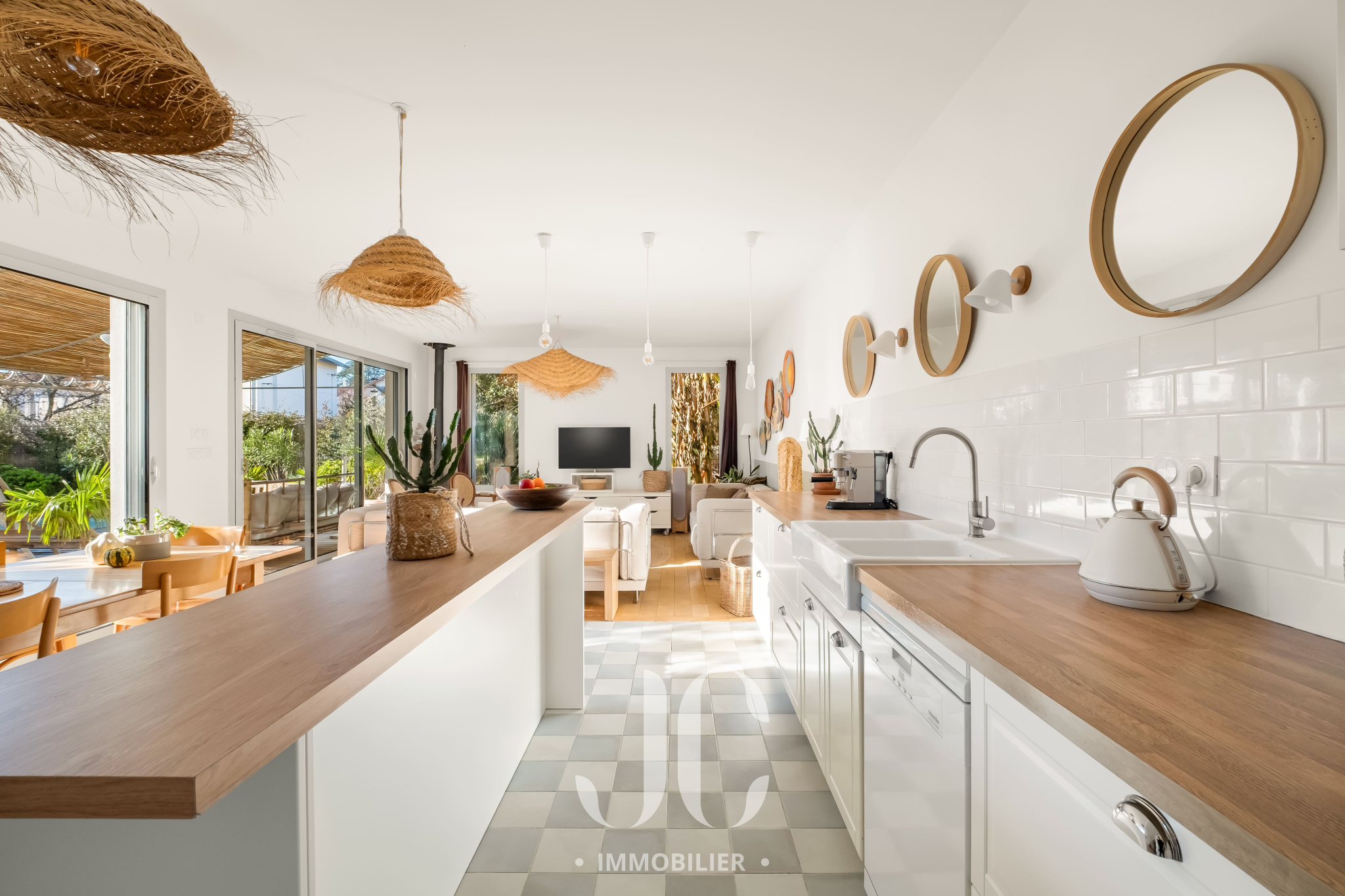 Le salon de réception, la cuisine parfaitement aménagée et l’espace dinatoire composent un ensemble fluide, baigné de lumière, pensé pour recevoir et savourer des moments privilégiés en famille ou entre amis.