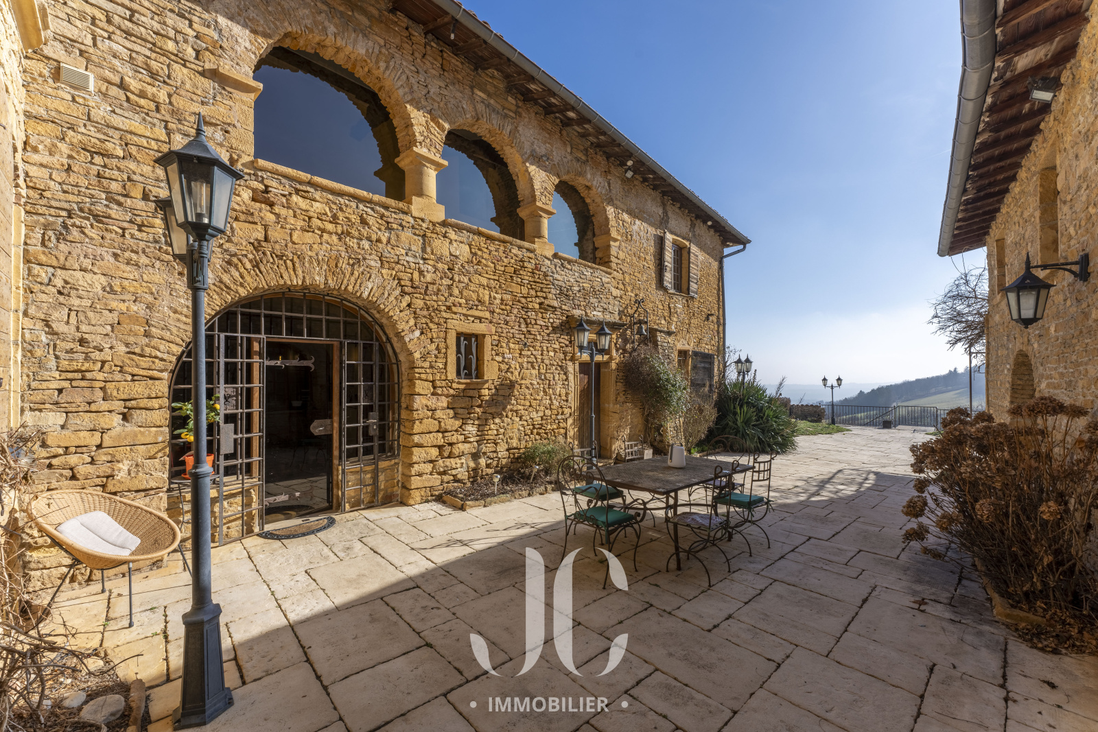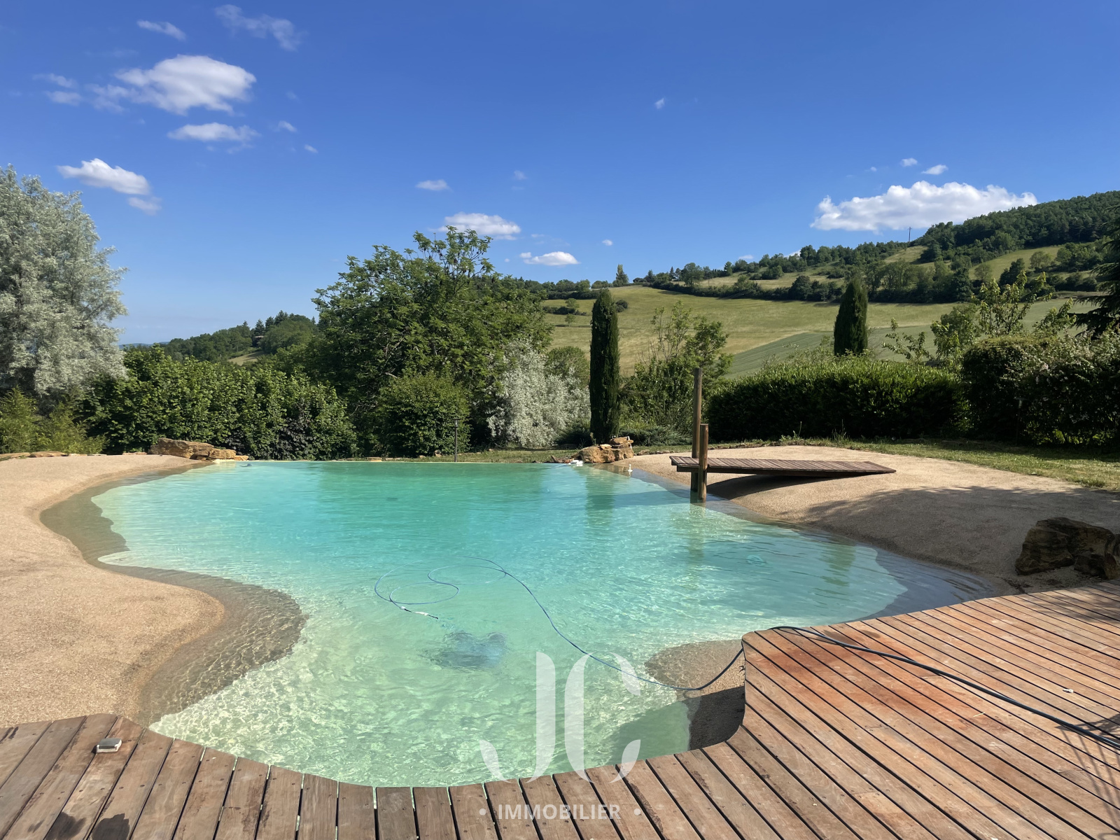 Profitez d'une grande terrasse avec vue panoramique exceptionnelle sur le vignoble du Beaujolais. Le terrain paysagé de 2349m², avec sa piscine aux airs de bassin naturel, sa cuisine d'été de 19m², offre un espace de détente privilégié.