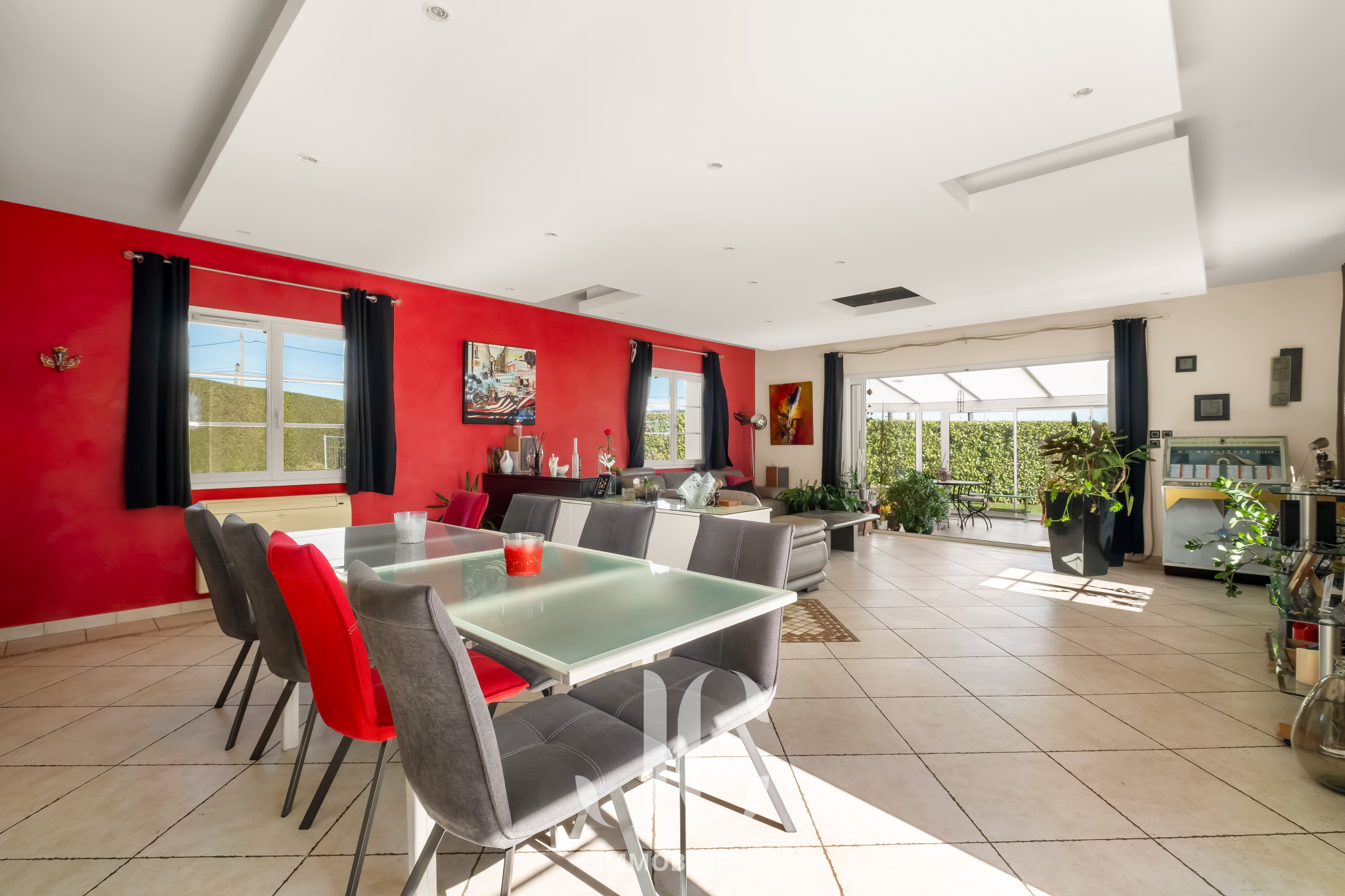 La maison séduit par sa luminosité et son ouverture sur l’extérieur. Les espaces de vie se prolongent naturellement vers les terrasses, le jardin et la piscine, avec une vue dégagée sur la campagne environnante.