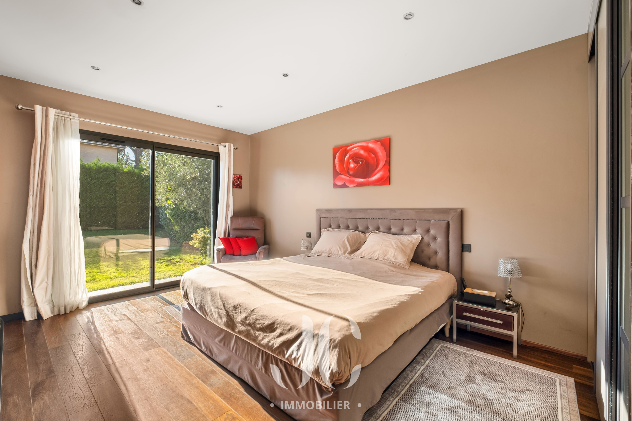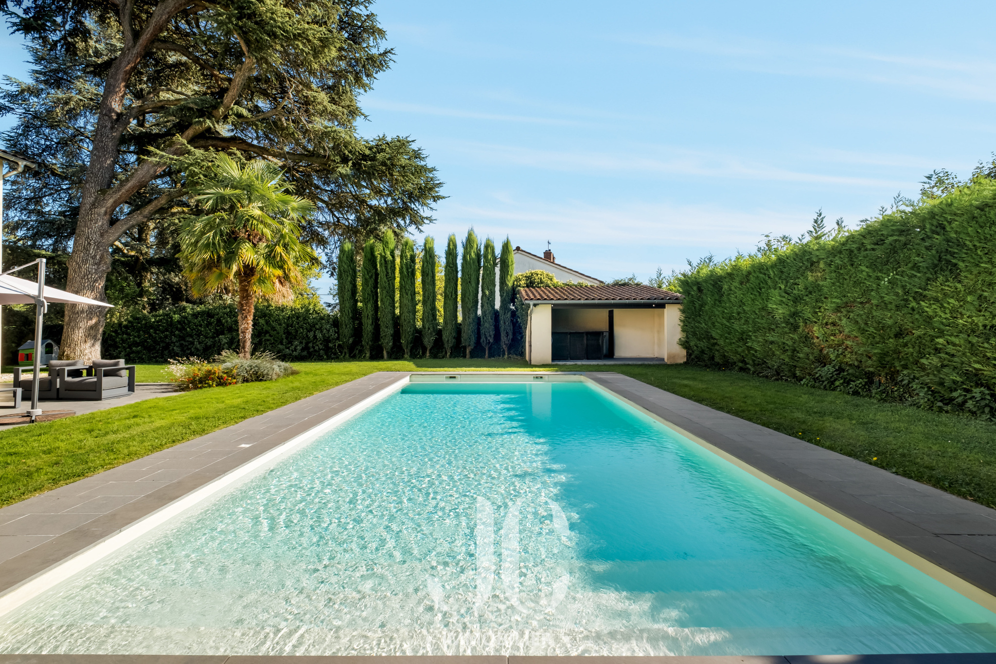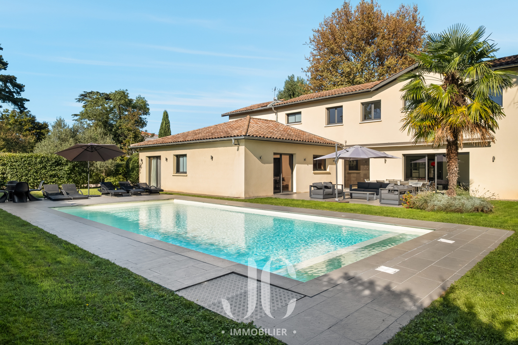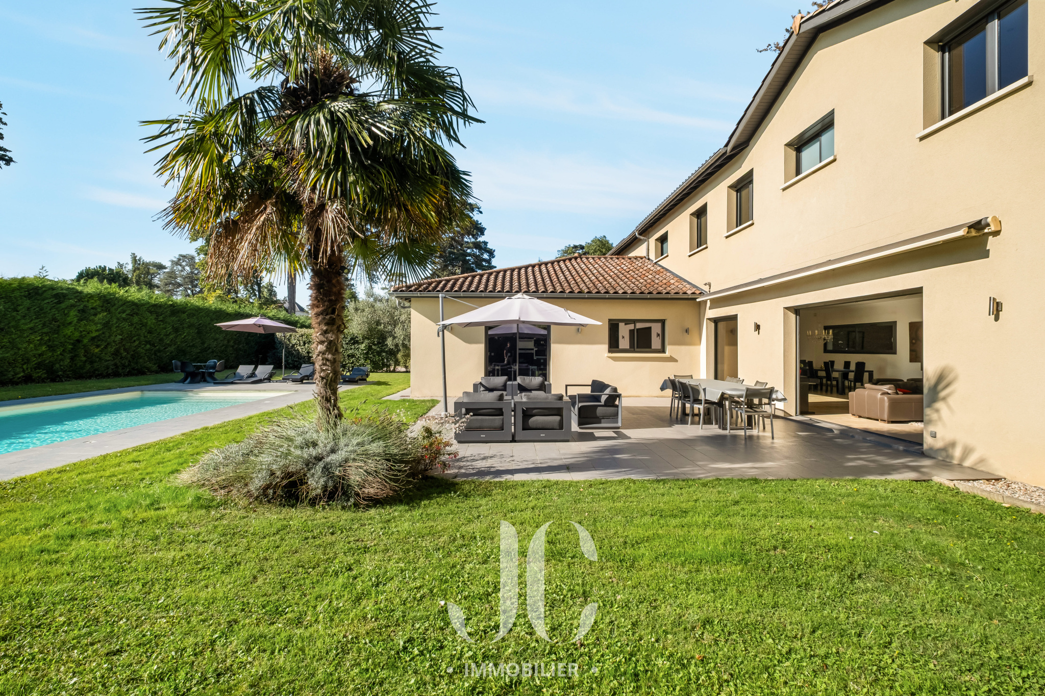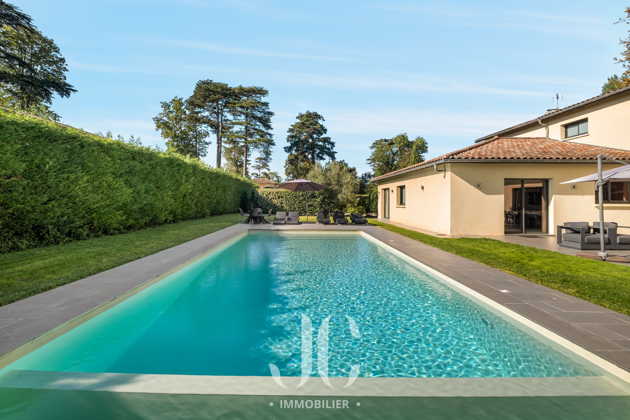 Cette propriété située au coeur d'une résidence magnifiquement arborée, vous fera à coup sûr, vivre des moments inoubliables de partage en famille et/ou entre amis. C'est la maison du bonheur, faite pour recevoir confortablement dans des conditions faisant plus référence à un lieu de villégiature qu'à une résidence principale. Et pourtant c'est bien là que vous profiterez au quotidien du confort qu'elle vous propose. En franchissant la porte d'entrée vous découvrirez alors une très spacieuse entrée donnant accès à une exceptionnelle pièce de réception de 100m² bénéficiant de nombreuses baies ouvrant sur la terrasse. Ainsi vous serez émerveillés par la luminisité permanente et par le sentiment que l'esprit dedans/dehors est une réalité en chaque instant. En terme d'espace, la cuisine de 30m² n'est pas en reste et propose un espace dinatoire ainsi qu'un cellier. De plain pied également, nous découvrirons une très spacieuse Master Suite avec la chambre ayant un accès direct au jardin, une salle de bains, dressing et wc. A ce niveau, un confortable bureau est également proposé ainsi qu'une buanderie et un accès au garage. A l'étage, nous restons dans un univers où l'espace et la luminosité sont au rendez-vous. Tout d'abord le palier fera son effet, avec un puits de lumière apportant un cachet incroyable, et vous donnera accès un espace nuit d'une rare dimension avec 4 chambres. Une première chambre desservie par une salle d'eau et un dressing. Deux autres chambres, bénéficiant d'une salle d'eau commune et une Suite complétant l'ensemble. Les surprises ne sont pas terminées car un sous-sol aménagé vous tend les bras avec un espace de 120m² pouvant être affecté à de nombreuses activités, salle de sport, salle de projection... Nous ne pouvons pas terminer cette visite sans être enthousiasmés par le jardin élégament arboré et profiant d'une magnifique piscine avec Pool House. Les mots ne suffisant pas pour présenter un tel lieu qu'une visite s'impose !!!