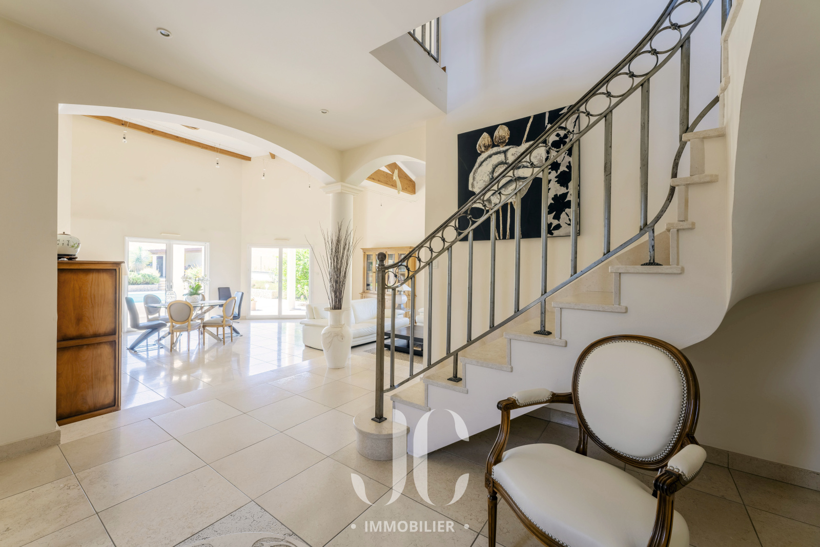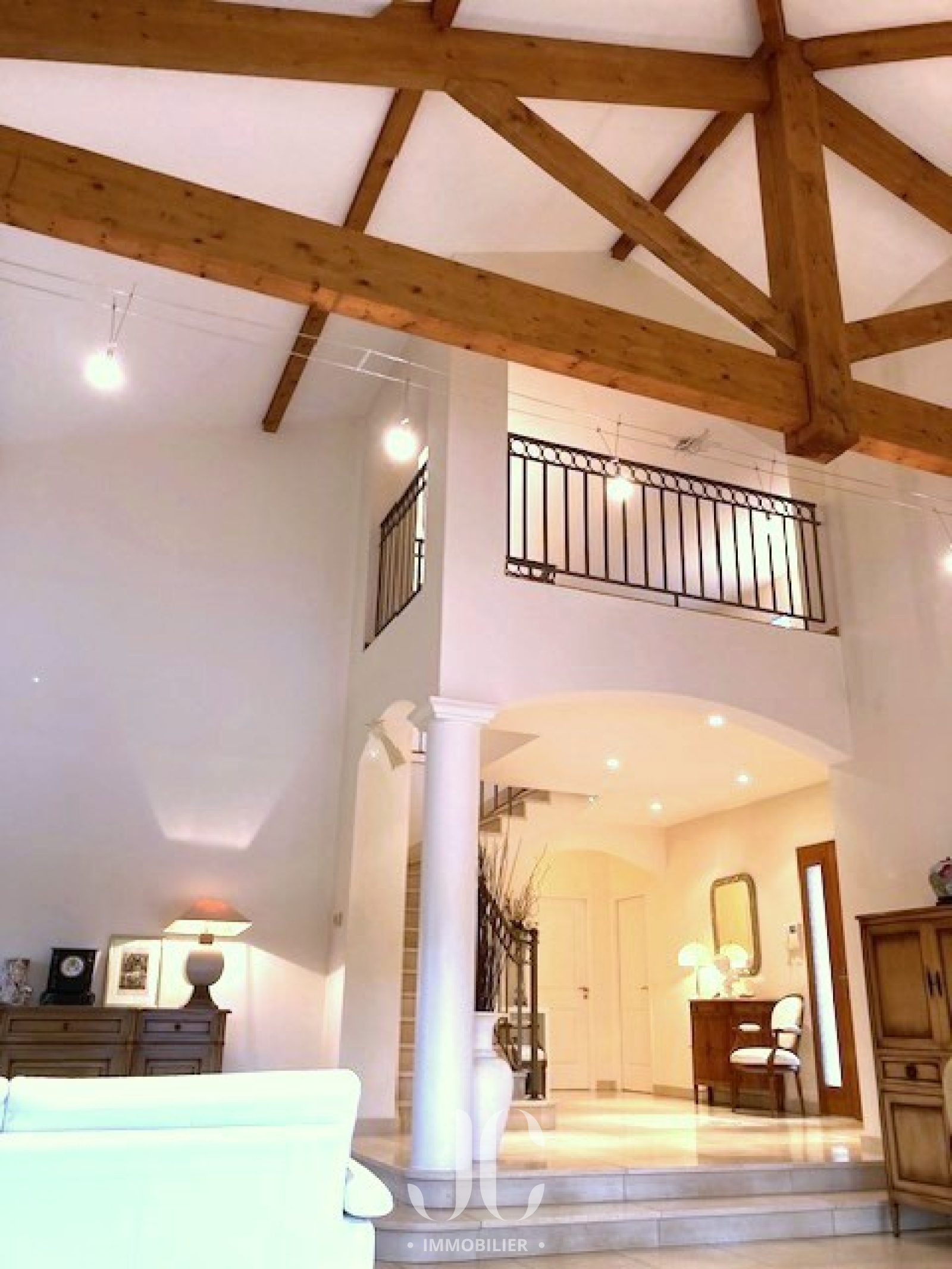 Un Intérieur Lumineux et Raffiné : Pénétrez dans un grand hall d'entrée qui s'ouvre majestueusement sur un salon cathédrale d'une luminosité exceptionnelle. Les baies à galandage offrent une vue imprenable sur le jardin paysager et la quiétude de la nature environnante. La hauteur sous plafond hors norme confère à cet espace une grandeur remarquable, tandis qu'un magnifique escalier en marbre invite à découvrir l'étage.