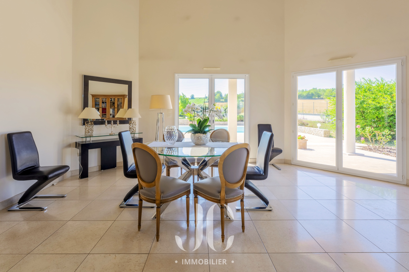 La cuisine, attenante et semi-ouverte sur le séjour, bénéficie d’une baie offrant un accès direct à la magnifique terrasse extérieure et à la piscine, créant une continuité harmonieuse entre intérieur et extérieur.