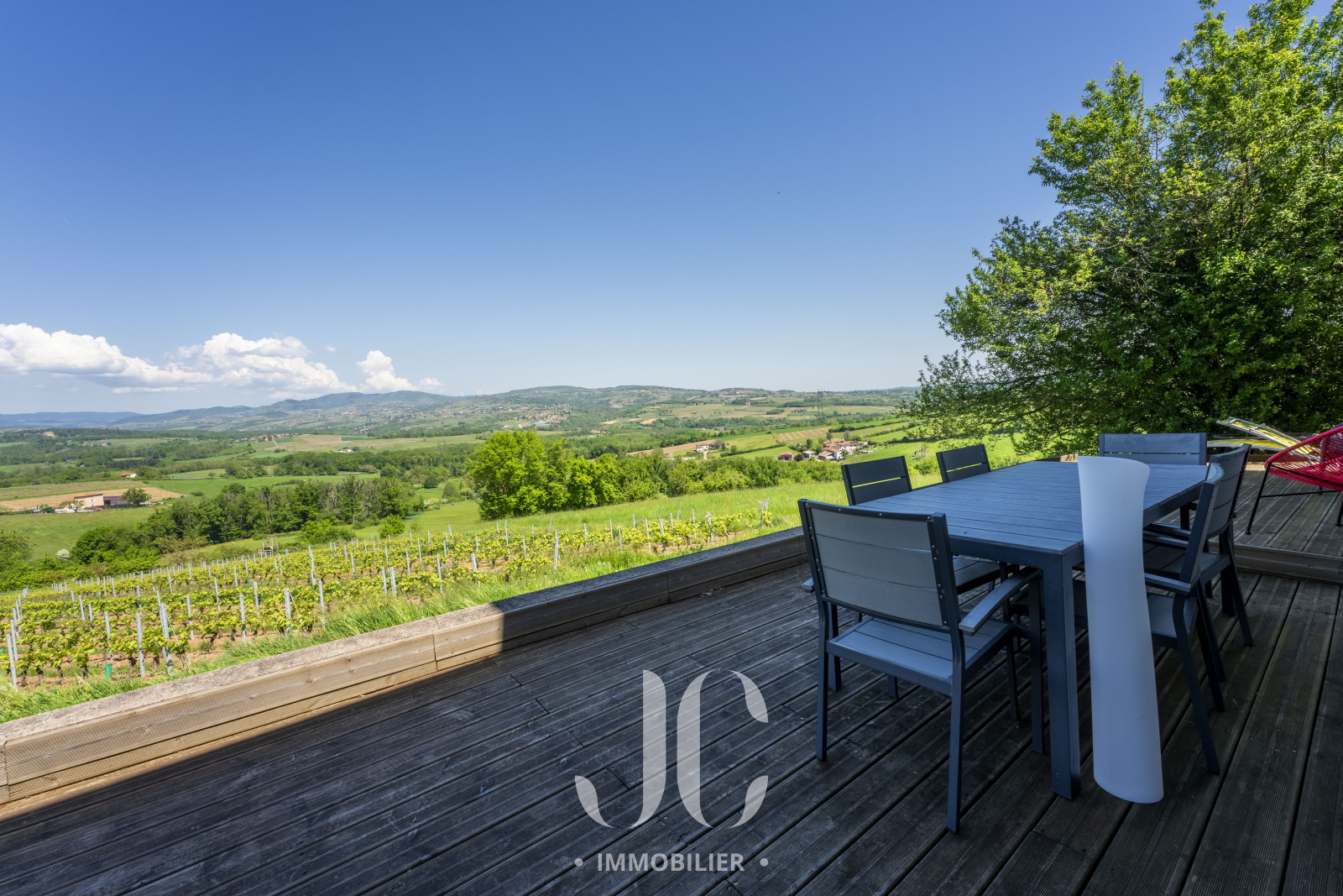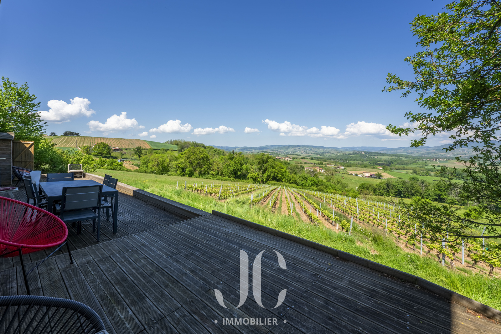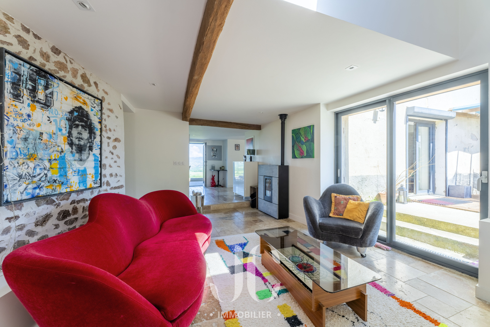 Son lumineux séjour-salle à manger de 37m², parfait pour recevoir, invite à la convivialité. La maison dispose également de 3 chambres et de 2 salles de bains, offrant un cadre de vie idéal dans un environnement privilégié, au milieu des paysages enchanteurs du Beaujolais.