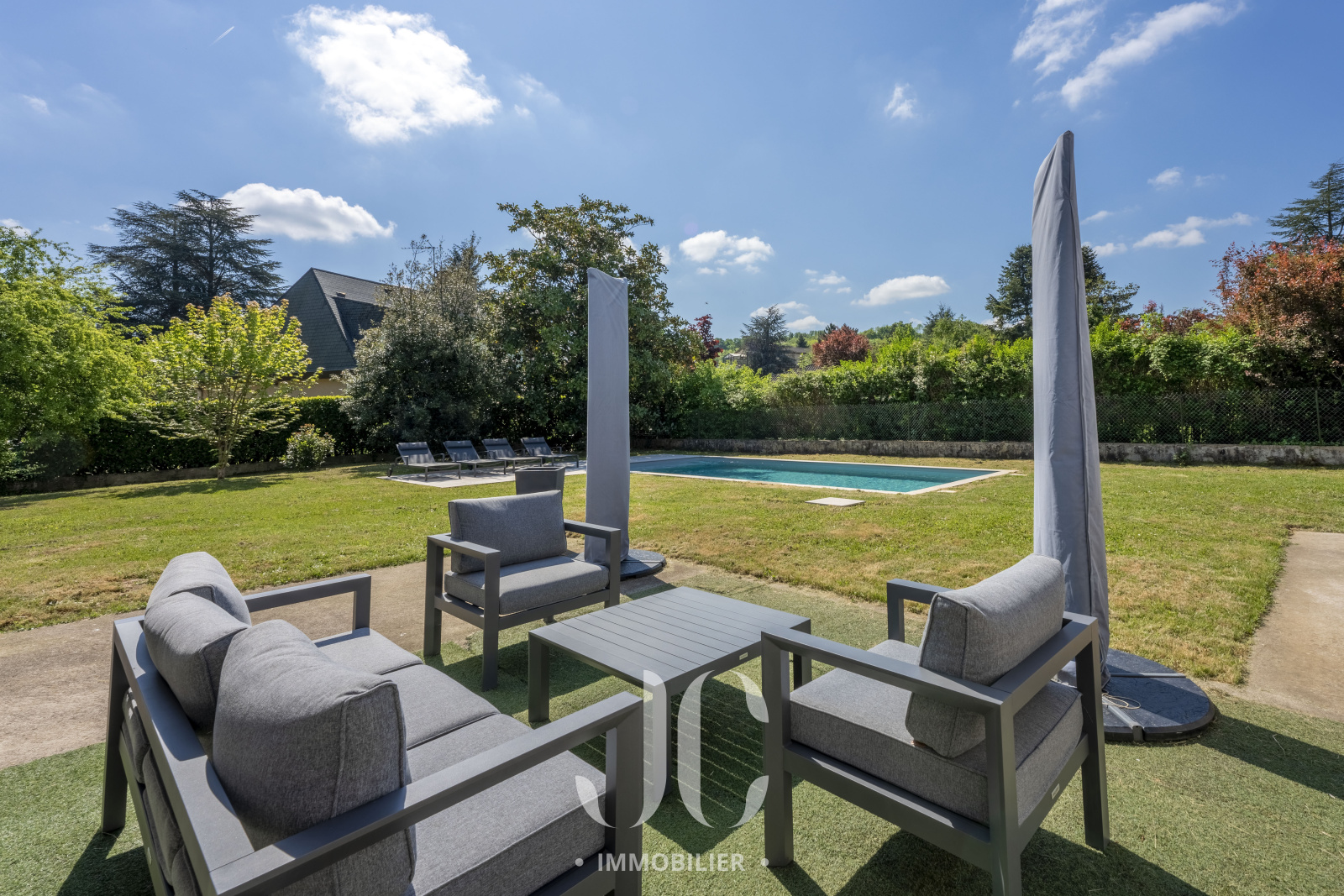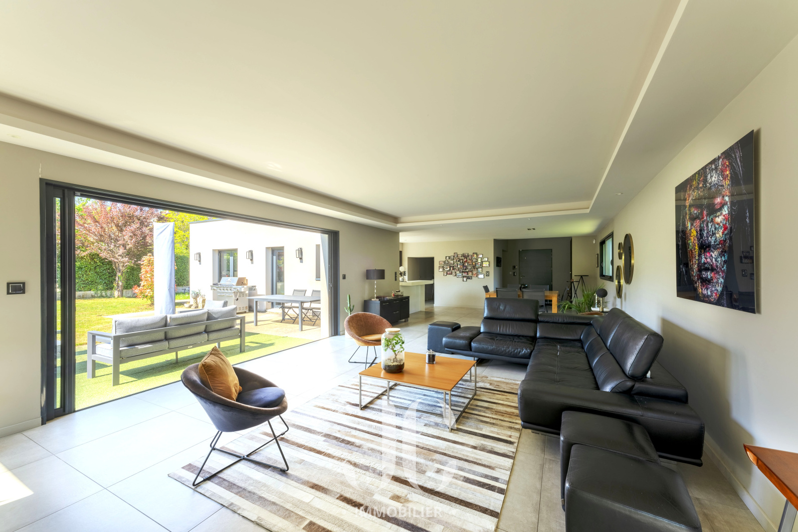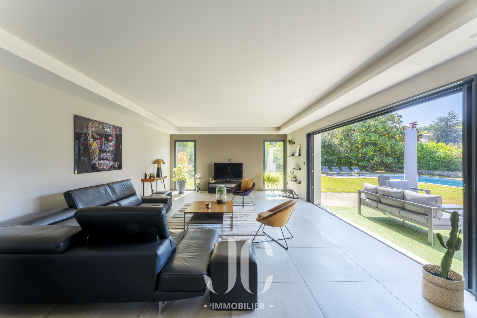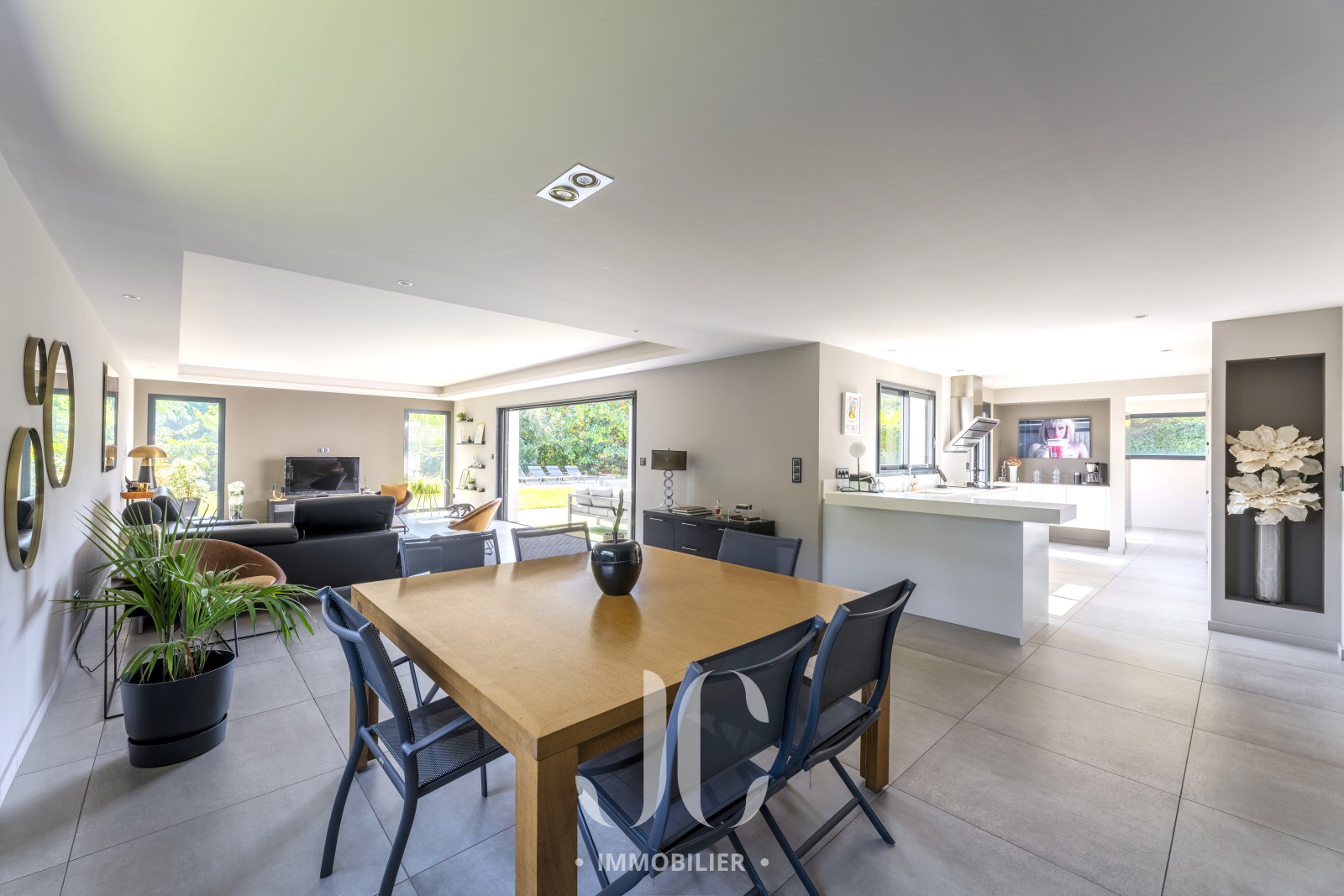 Cette pièce de vie s'ouvre harmonieusement sur un extérieur de 1310m² avec une piscine invitant à la détente et une grande terrasse idéale pour les repas en plein air et les moments de convivialité au sein d'un jardin paysager conçu avec soin.