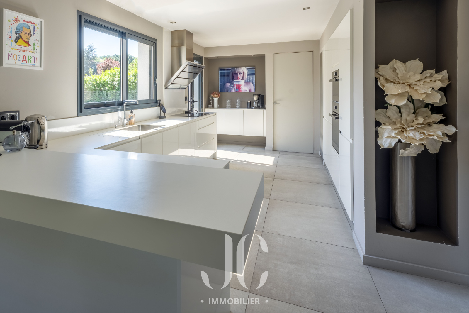 La cuisine, entièrement équipée, est conçue avec des matériaux de qualité et un design actuel, offrant un lieu de convivialité idéal pour les moments en famille ou entre amis.