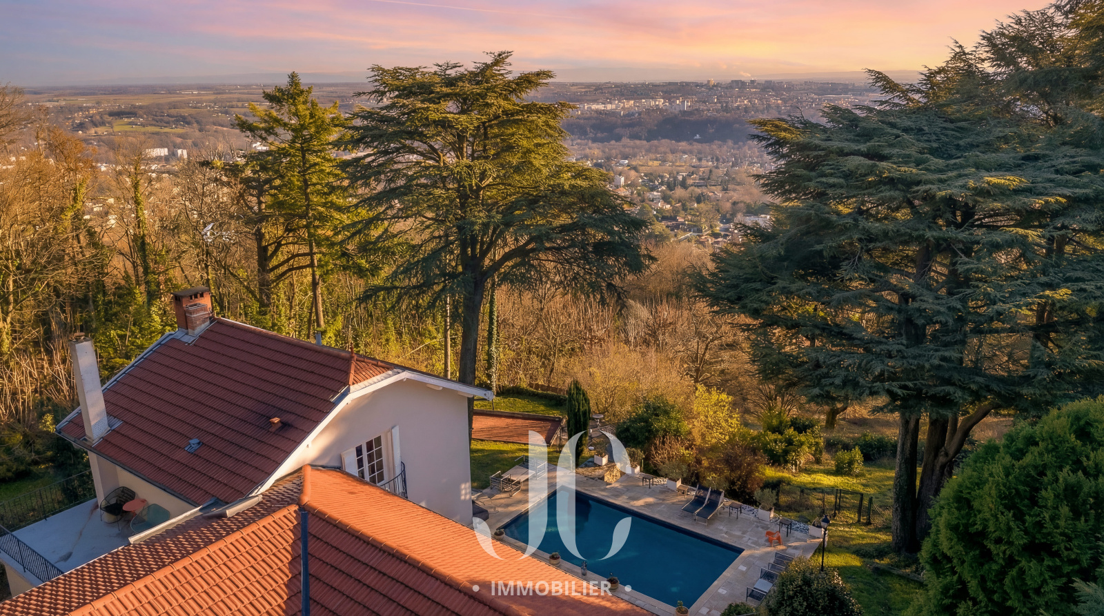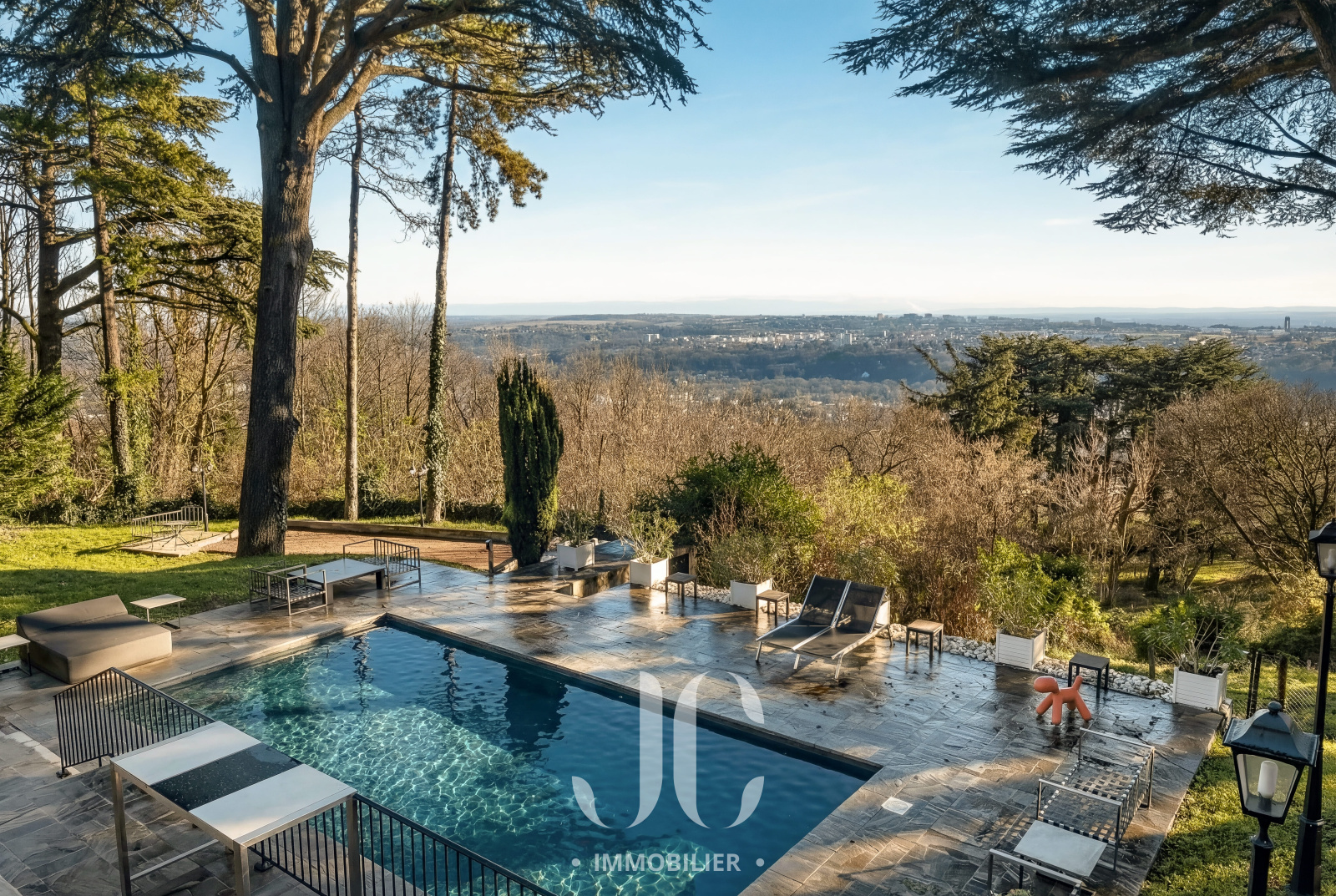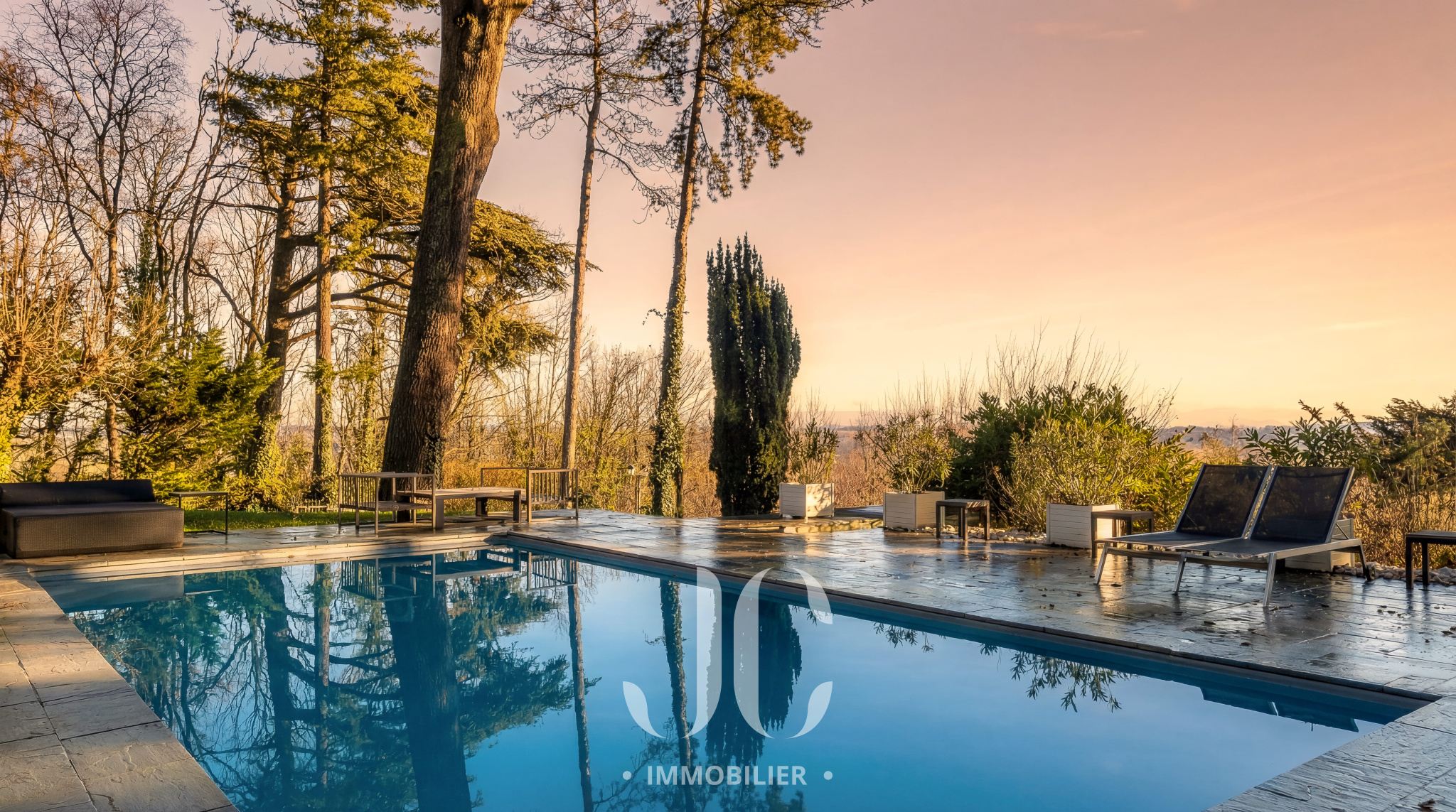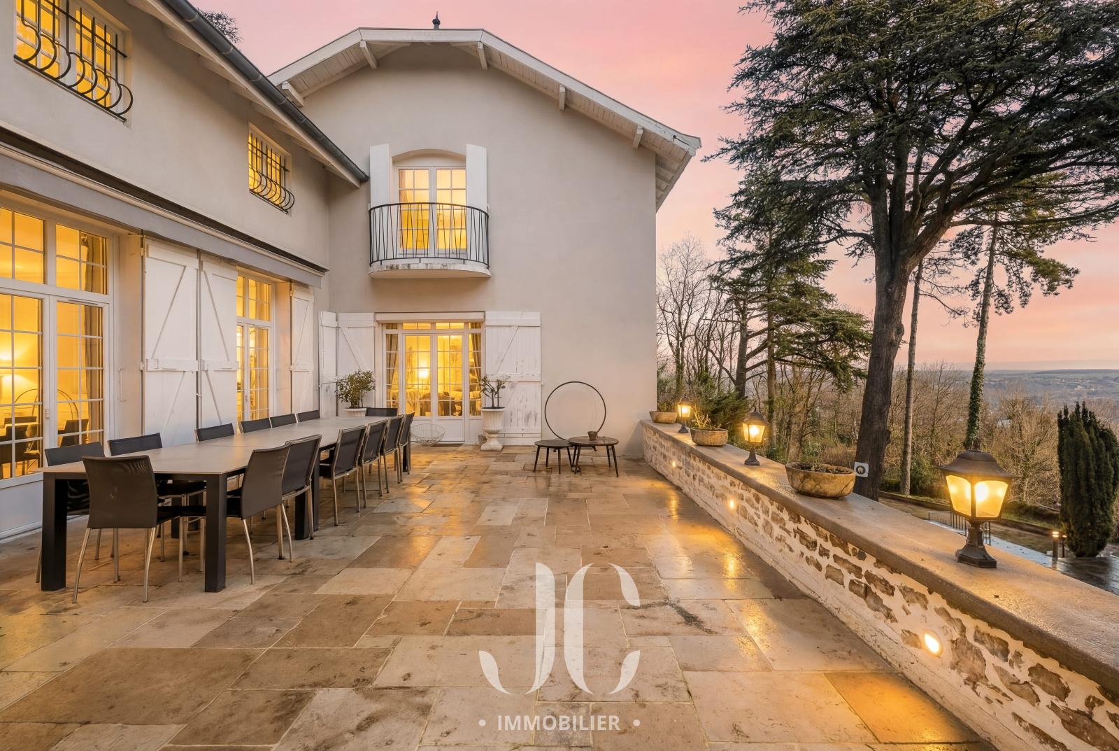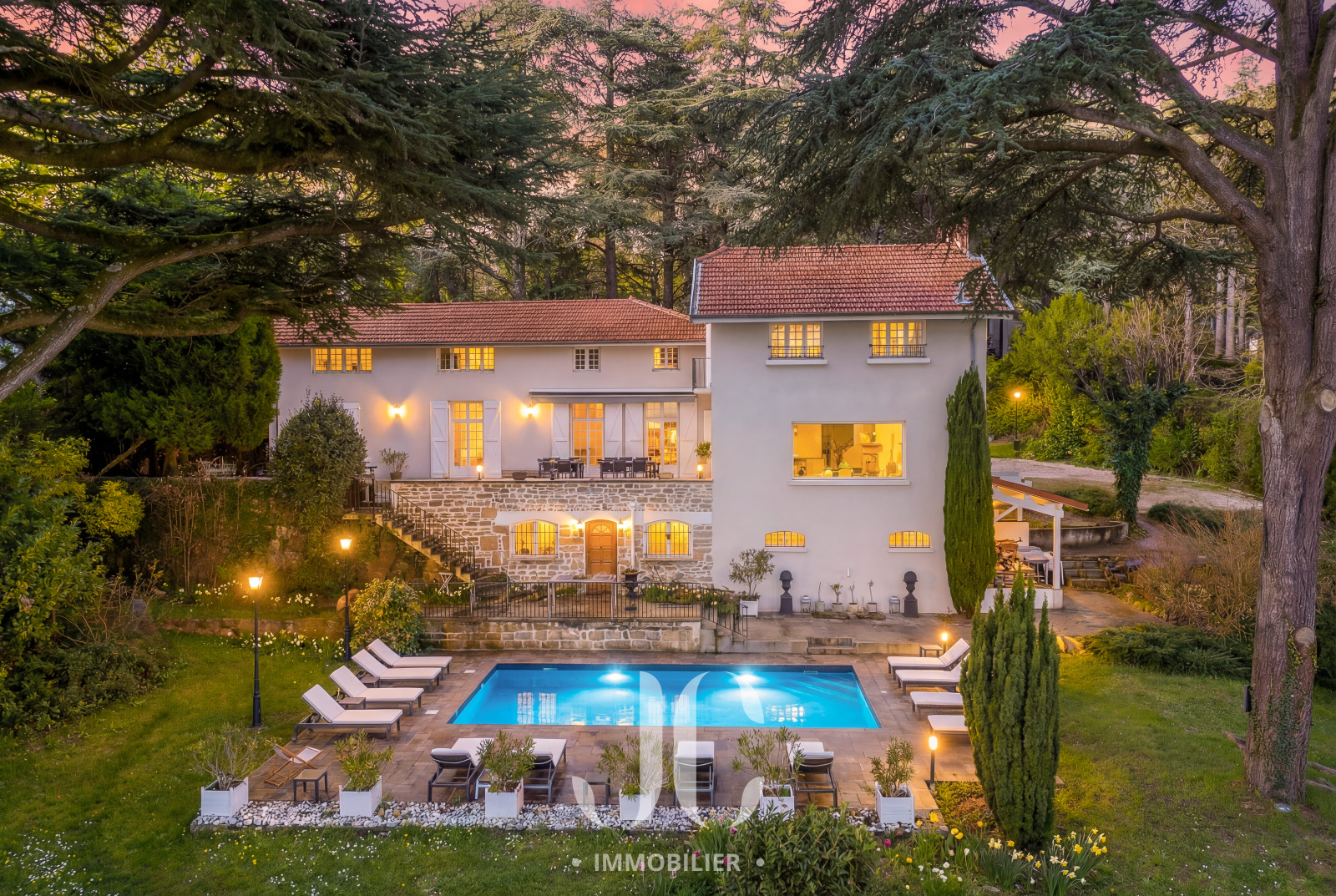 Bien plus qu'un lieu de vie c'est un art de vivre que nous vous proposons avec cette propriété. La bâtisse d'une surface totale de 420m² est comme un joyau dans son écrin de nature de 9500m² à la vue exceptionnelle. Sa localisation idéale permet de profiter d'un environnement naturel exceptionnel tout en bénéficiant d'une proximité de ce village très prisé des Monts d'Or et du centre de Lyon. Le dépaysement n'opére pas uniquement grâce à l'environnement. Dès que vous franchirez la porte vous accéderez à une entrée au tempérament envoûtant dans un style qui vous laisse envisager la sérénité et le bien être. Cela se confirmera lors de la découverte de l'espace principal de 70m² qui vous laissera sans voix grâce à une vue exceptionnelle aux airs de carte postale. Le salon de réception vous permettra de profiter de moments inoubliables en profitant d'une magnifique cheminée d'époque. La cuisine n'est pas en reste avec un équipement et une ambiance laissant augurer des repas savoureux en profitant également d'un espace dinatoire très confortable. Cet ensemble bénéficiant de nombreux accès à une première terrasse, tel un promontoire dominant l'ensemble de la propriété et l'espace piscine. Toujours en rez de chaussée, vous découvirez une très spacieuse Master Suite de 50m². Egalement un très vaste bureau complète ce niveau. Au niveau supérieur, un couloir transpirant de charme distribue la partie nuit qui est composée de 5 chambres très spacieuses dont deux Suites avec accès à une terrasse donnant ainsi un cachet unique. Pour les adeptes de surprises et d'espaces renvoyant à une idée de moments inoubliables, rendez-vous au niveau inférieur, de plain pied avec la terrasse principale et la piscine, pour découvrir un espace entièrement équipé pouvant faire office de cuisine d'été et de salle de jeux avec bar pour les soirées festives. Ne manque plus que de vous proposer la découverte d'une magnifique cave à vins qui vous tend les bras pour y entreposer vos meilleurs crus. Une dernière surprise vous attend, mais visitons pour en savoir plus !