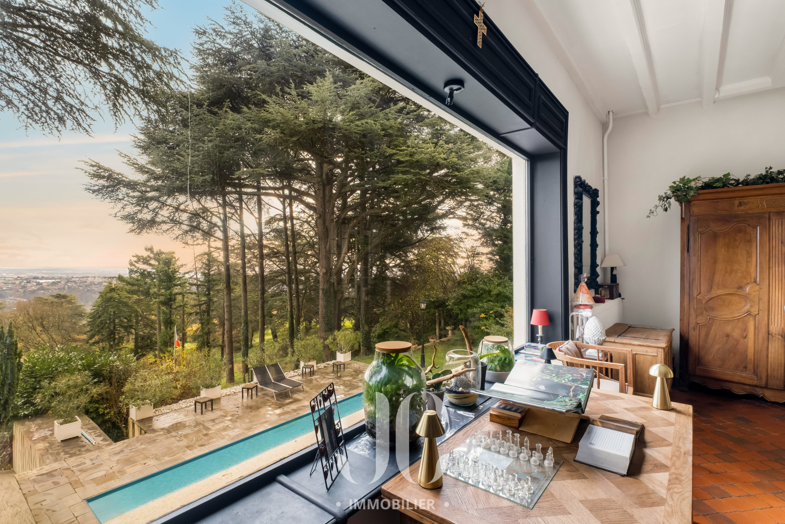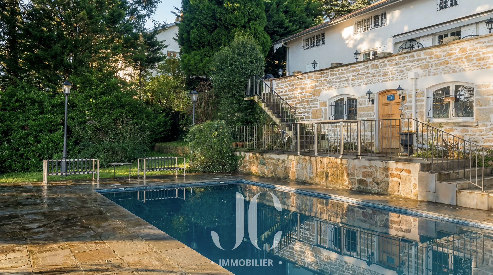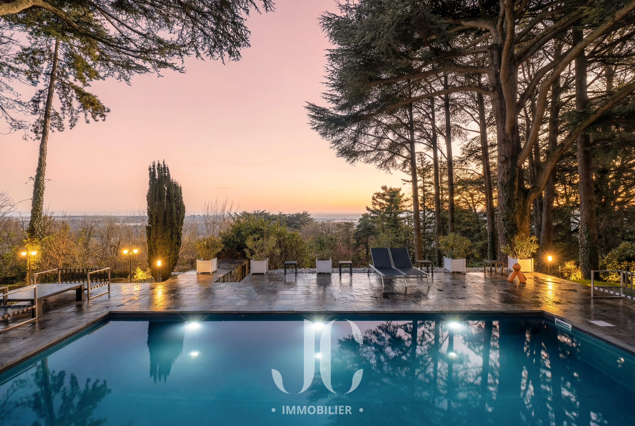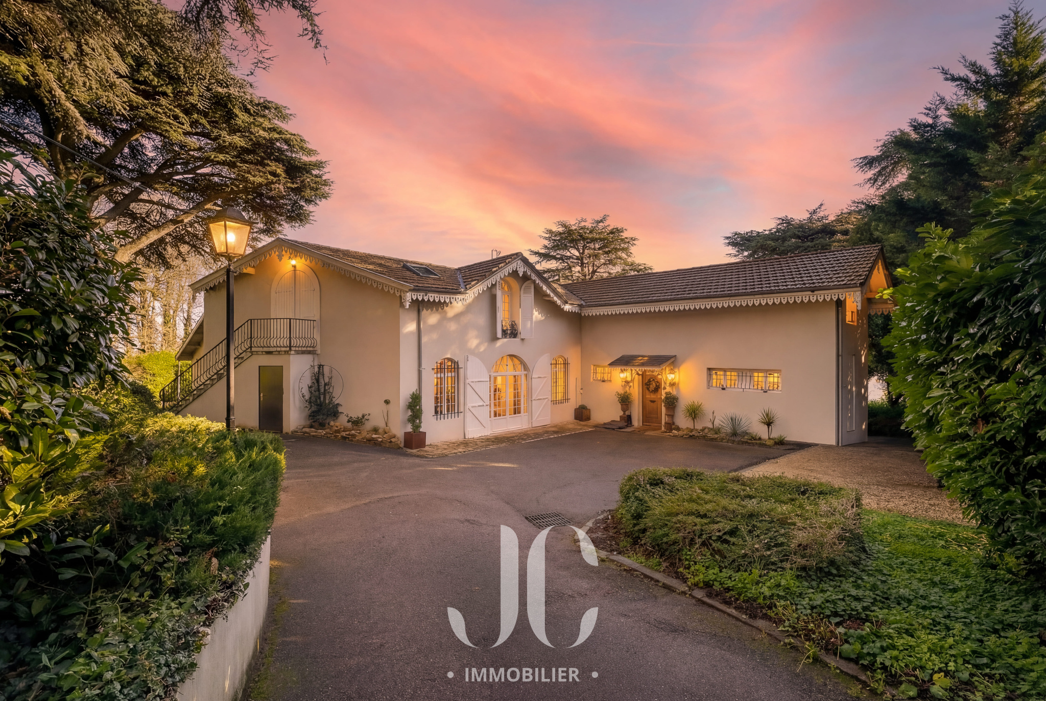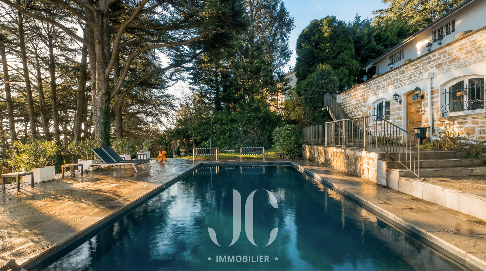 Bien plus qu'un lieu de vie c'est un art de vivre que nous vous proposons avec cette propriété. La bâtisse d'une surface totale de 420m² est comme un joyau dans son écrin de nature de 9500m² à la vue exceptionnelle. Sa localisation idéale permet de profiter d'un environnement naturel exceptionnel tout en bénéficiant d'une proximité de ce village très prisé des Monts d'Or et du centre de Lyon. Le dépaysement n'opére pas uniquement grâce à l'environnement. Dès que vous franchirez la porte vous accéderez à une entrée au tempérament envoûtant dans un style qui vous laisse envisager la sérénité et le bien être. Cela se confirmera lors de la découverte de l'espace principal de 70m² qui vous laissera sans voix grâce à une vue exceptionnelle aux airs de carte postale. Le salon de réception vous permettra de profiter de moments inoubliables en profitant d'une magnifique cheminée d'époque. La cuisine n'est pas en reste avec un équipement et une ambiance laissant augurer des repas savoureux en profitant également d'un espace dinatoire très confortable. Cet ensemble bénéficiant de nombreux accès à une première terrasse, tel un promontoire dominant l'ensemble de la propriété et l'espace piscine. Toujours en rez de chaussée, vous découvirez une très spacieuse Master Suite de 50m². Egalement un très vaste bureau complète ce niveau. Au niveau supérieur, un couloir transpirant de charme distribue la partie nuit qui est composée de 5 chambres très spacieuses dont deux Suites avec accès à une terrasse donnant ainsi un cachet unique. Pour les adeptes de surprises et d'espaces renvoyant à une idée de moments inoubliables, rendez-vous au niveau inférieur, de plain pied avec la terrasse principale et la piscine, pour découvrir un espace entièrement équipé pouvant faire office de cuisine d'été et de salle de jeux avec bar pour les soirées festives. Ne manque plus que de vous proposer la découverte d'une magnifique cave à vins qui vous tend les bras pour y entreposer vos meilleurs crus. Une dernière surprise vous attend, mais visitons pour en savoir plus !