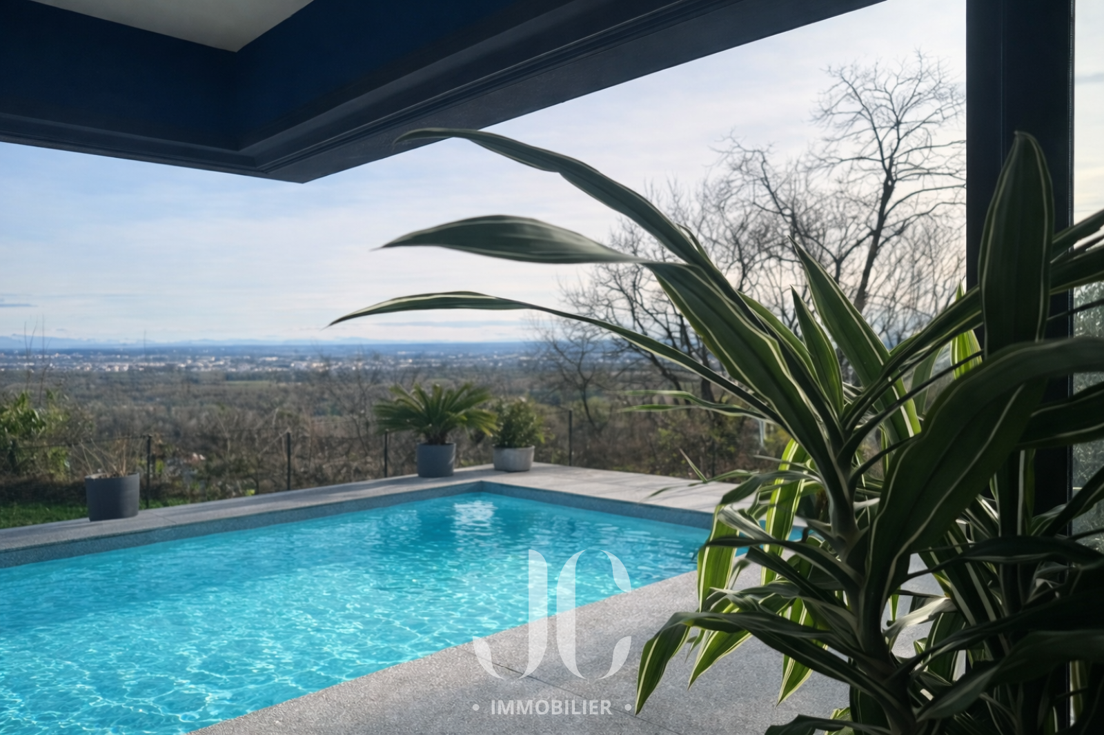 Les extérieurs, soigneusement aménagés, constituent un véritable atout, avec un terrain de 960 m². La terrasse accueille une piscine élégante, parfaitement intégrée dans son environnement, offrant une vue panoramique exceptionnelle et une atmosphère résolument paisible. L’ensemble est pensé pour profiter pleinement des beaux jours, dans un cadre intime et privilégié, propice à la détente comme à la réception.