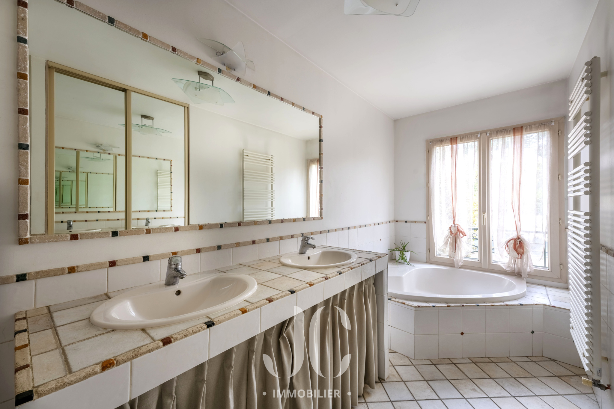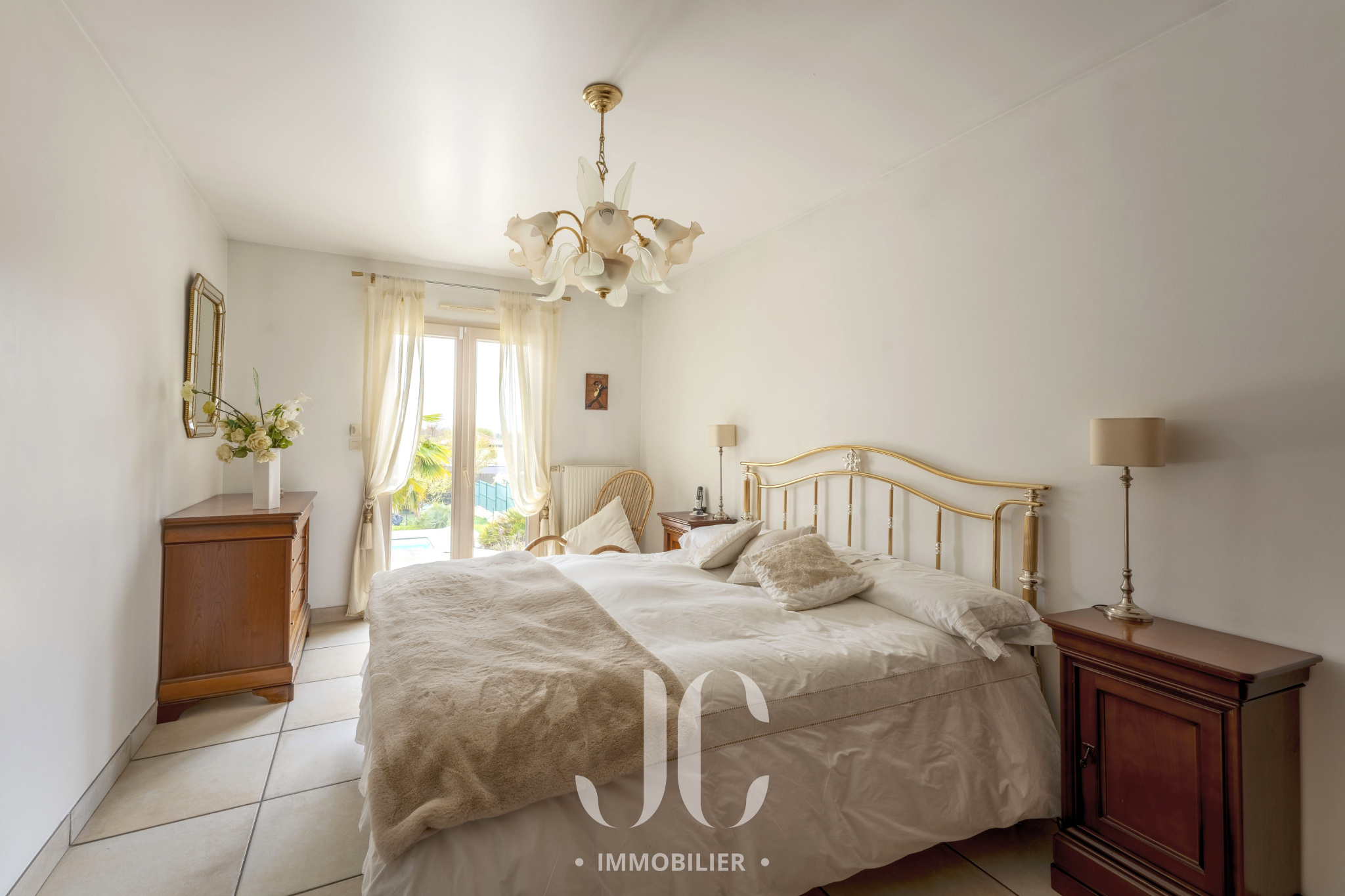 À l’extérieur, le jardin paysagé, sans vis-à-vis, forme un véritable écrin de verdure où la piscine s’intègre avec élégance dans un environnement calme et préservé.