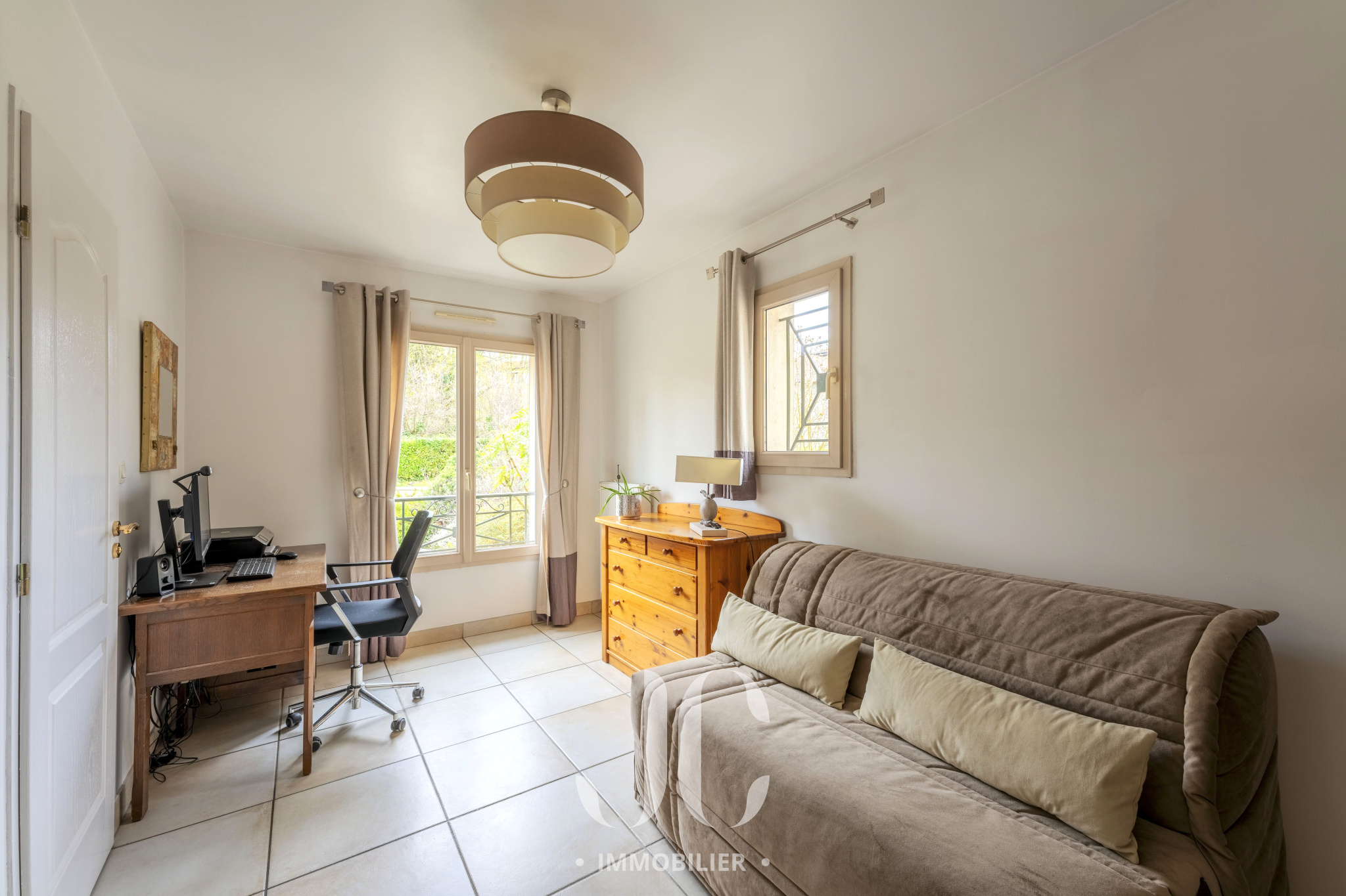 L’agencement offre une véritable vie de plain-pied avec deux chambres, dont une suite avec dressing et salle de bains. À l’étage, trois chambres supplémentaires, une salle de bains et une élégante mezzanine composent un espace nuit confortable et parfaitement distribué.