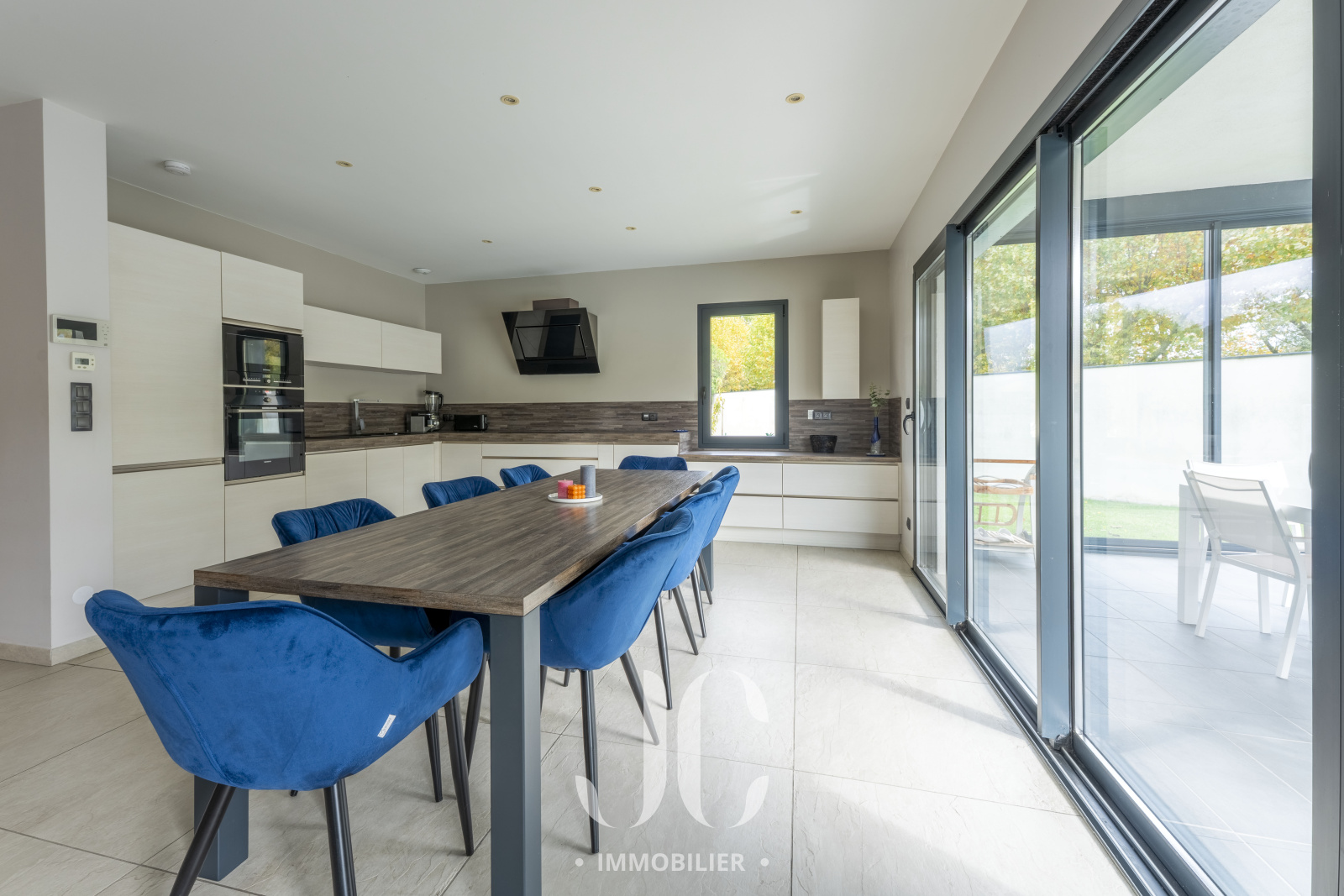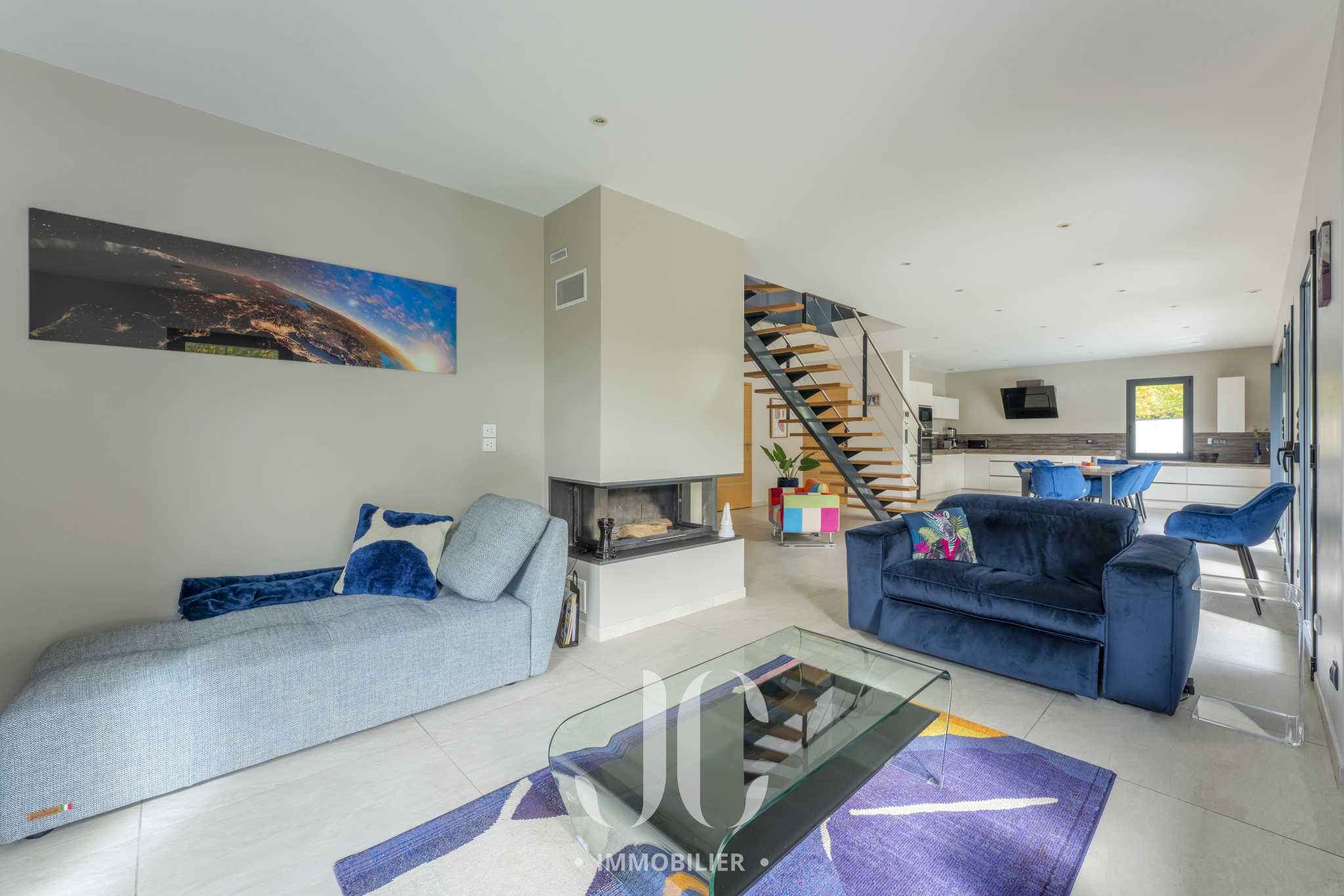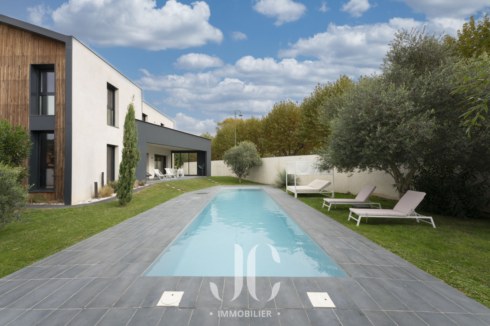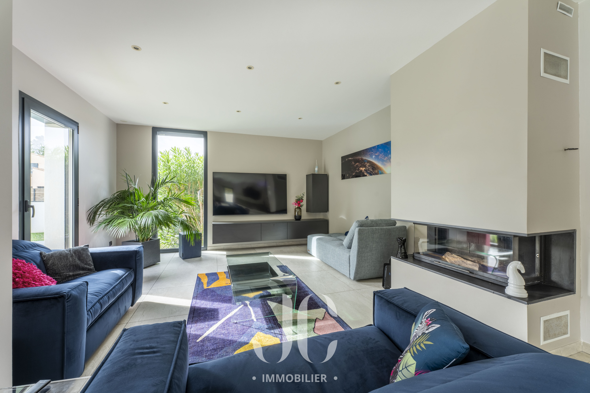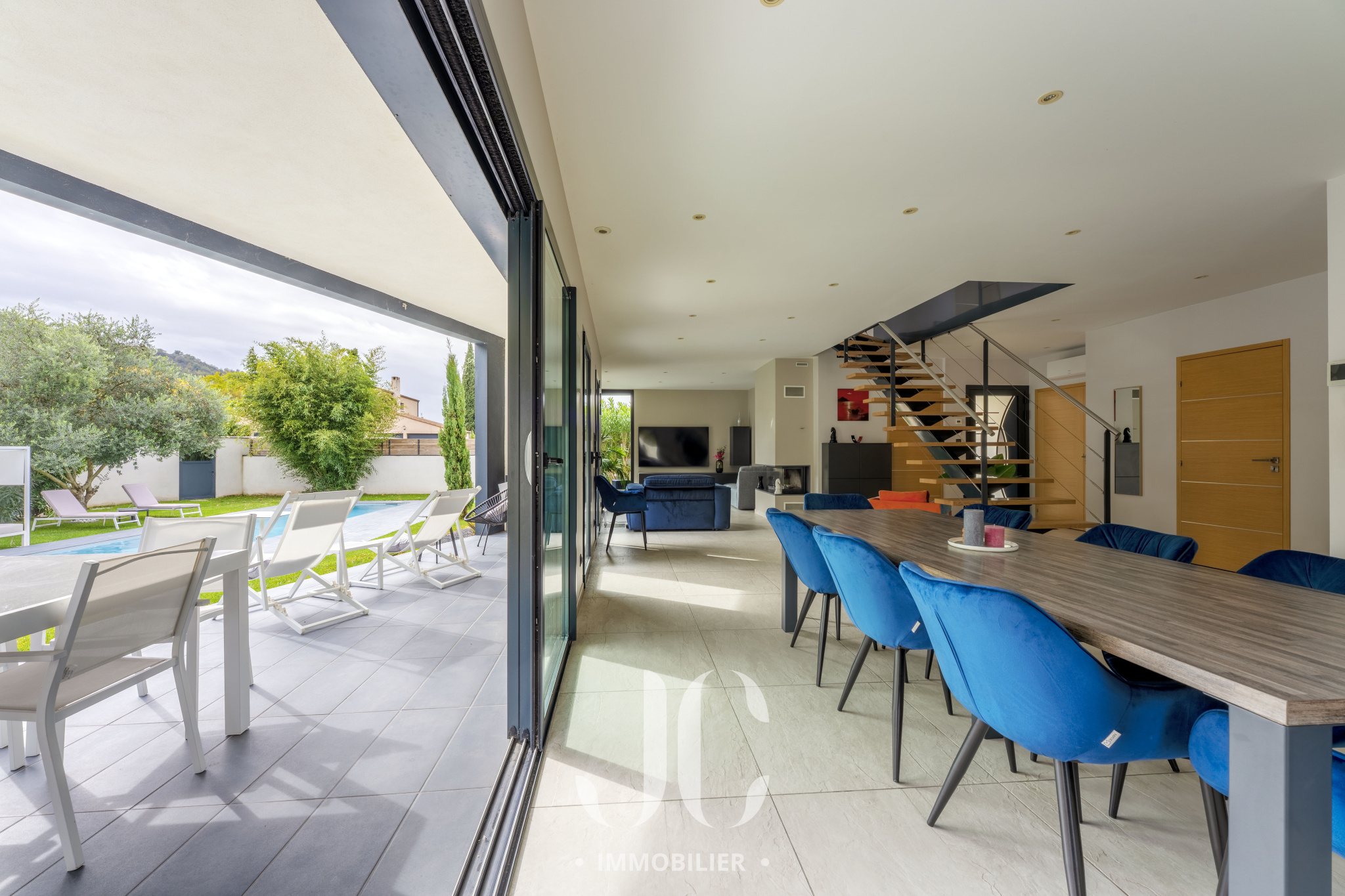 La maison a été pensée pour s'adapter à son environnement, la spacieuse pièce de vie de 70m² allie luminosité et confort , ses grandes ouvertures vous permettent d'apprécier le calme intime du jardin et renforcent ce sentiment de bien-être, vous adorerez l'été avec la vue sur la piscine et les oliviers autant que l'hiver au coin d'un bon feu de cheminée.