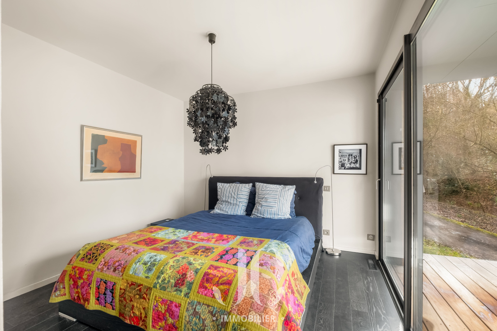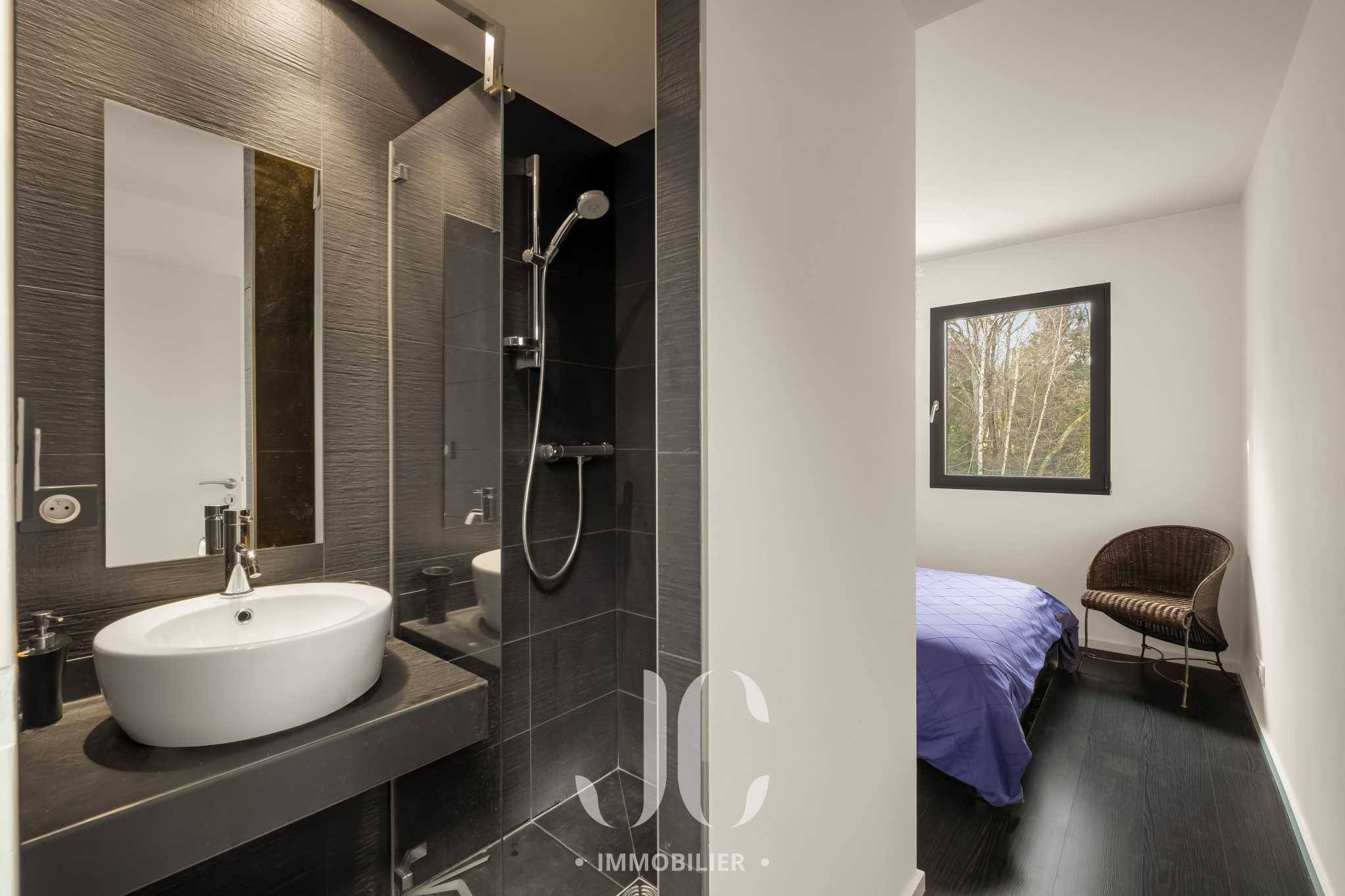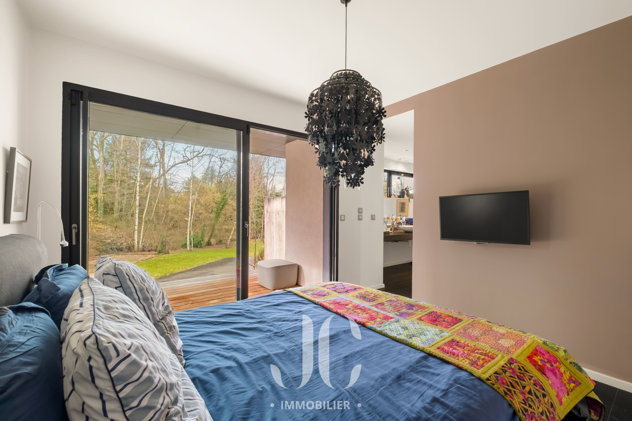 Toujours au rez-de-chaussée, une très belle suite parentale bénéficie elle aussi d’une large ouverture sur l’extérieur, invitant à la sérénité.