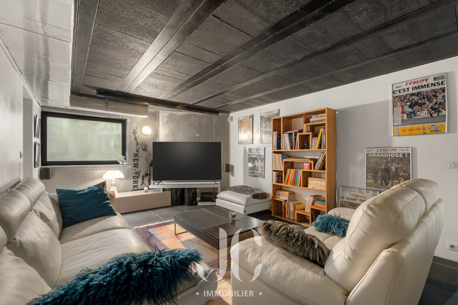 En rez-de-jardin, avec accès direct à l’extérieur, une salle de projection intimiste promet de mémorables soirées cinéma.