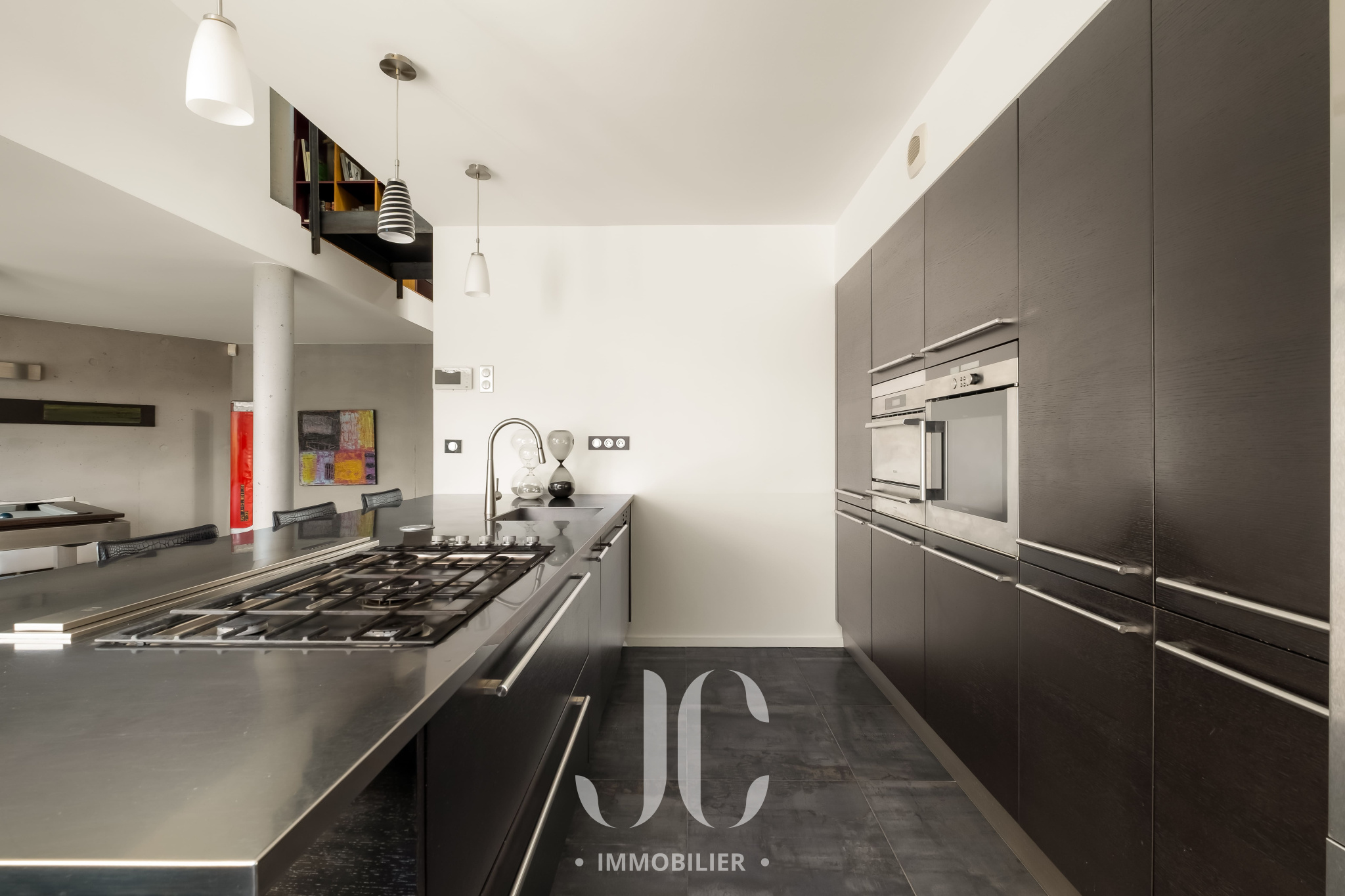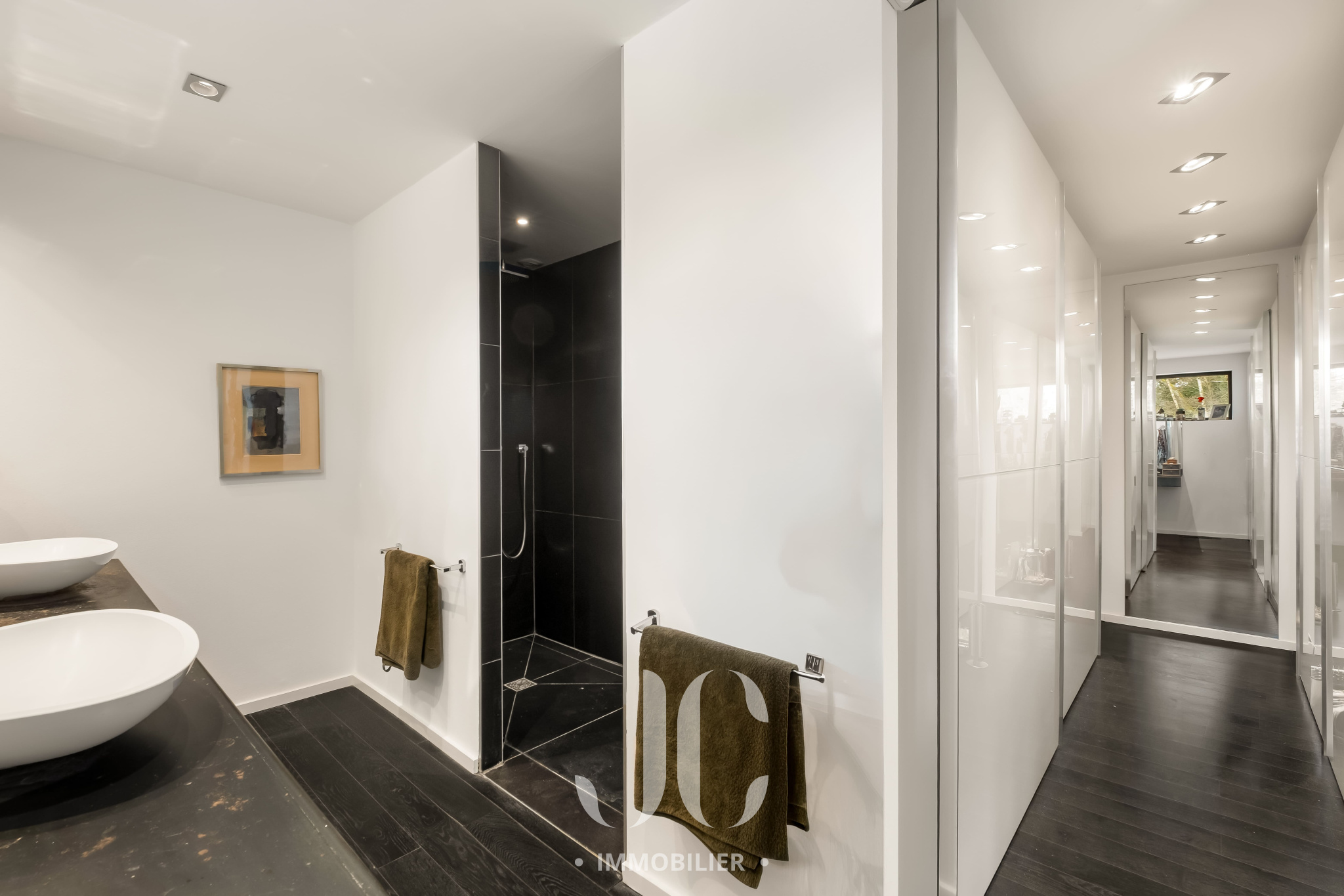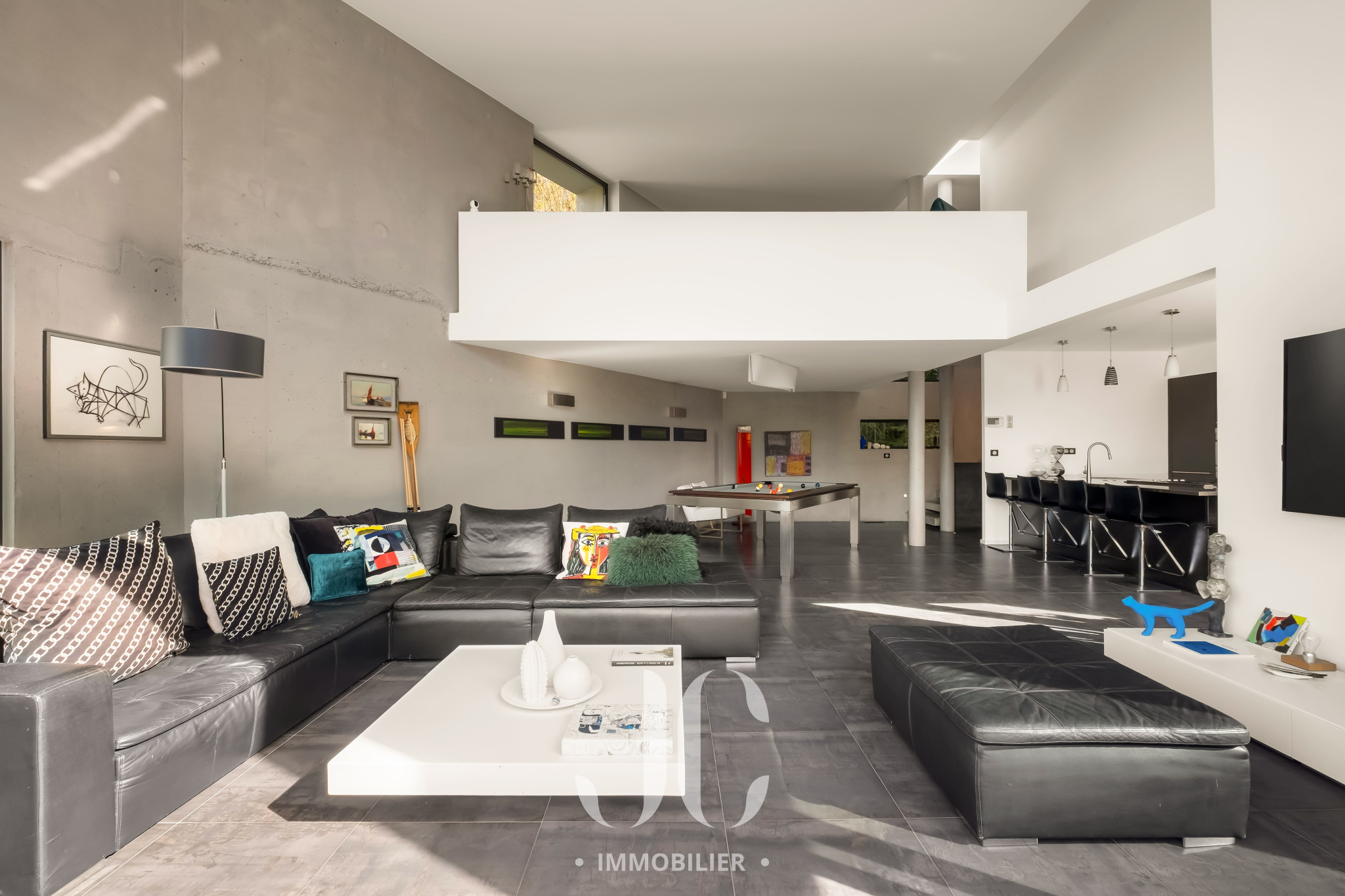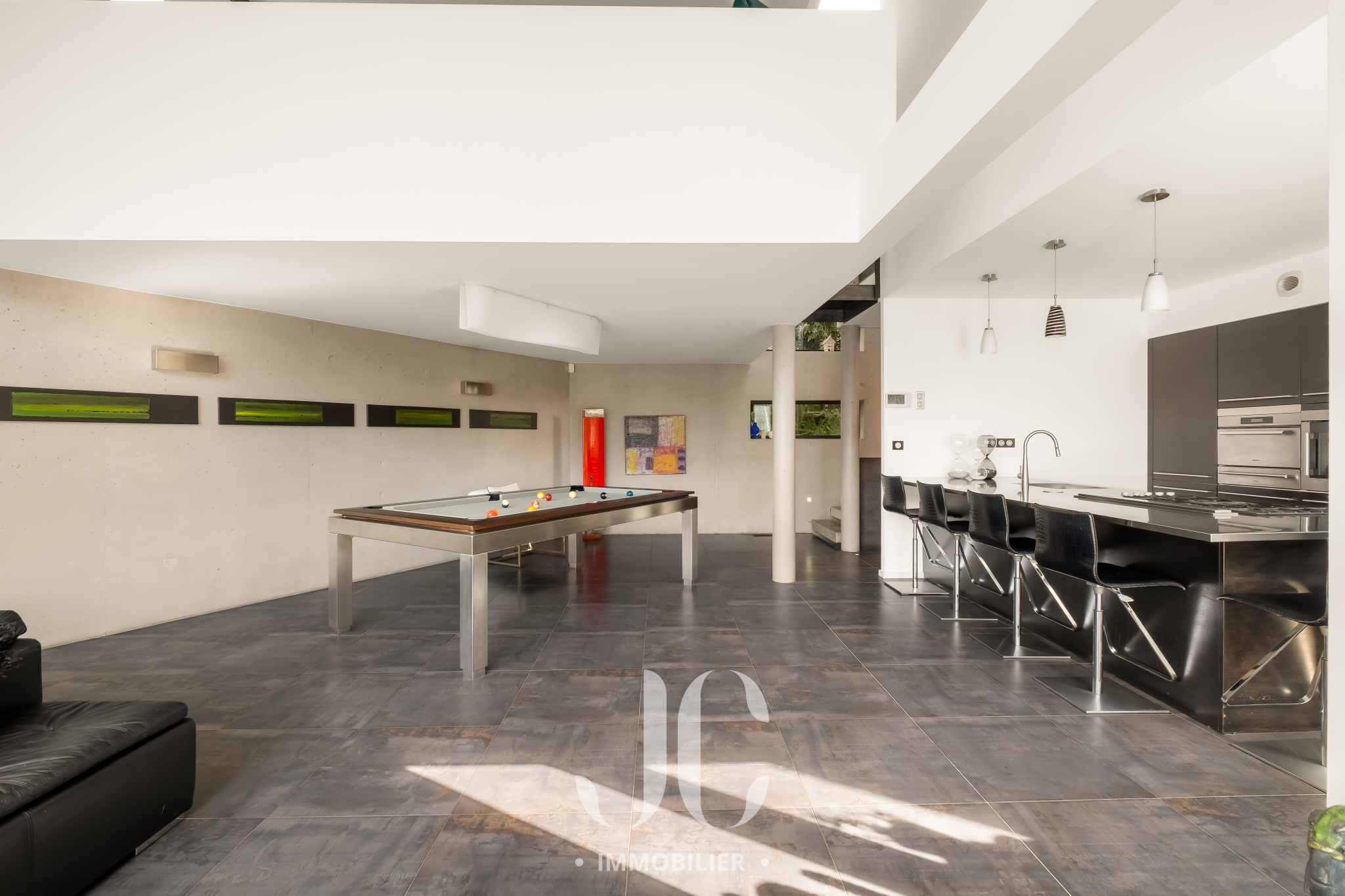 L’espace de vie, généreux et convivial, se compose d’un élégant salon de réception, d’un espace dinatoire et d’une superbe cuisine contemporaine. De larges baies vitrées prolongent harmonieusement cet ensemble vers une vaste terrasse et un espace piscine, offrant une vue dominante sur le parc paysager.