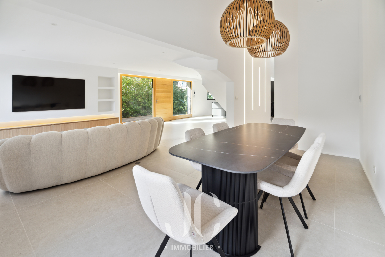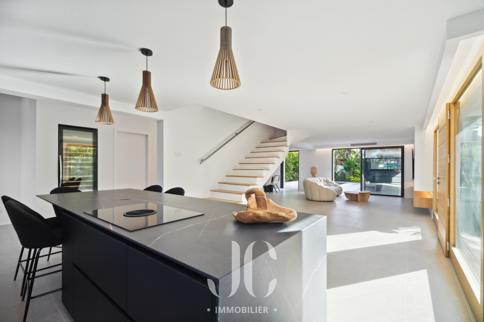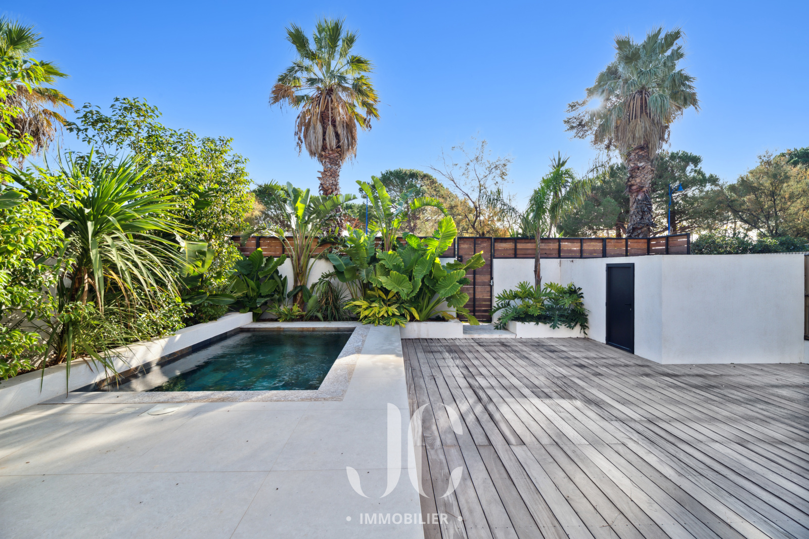 Moderne, chic, standing, cocoon sont les qualificatifs que nous pouvons utiliser pour décrire cette magnifique maison contemporaine tout en y ajoutant accès plage 3 mn à pied, port à 5 mn et esprit village grâce aux commerces à portée de main. De construction très récente, elle propose un univers doté d'un confort absolu et de véritables prestations de standing. Dès le portail franchi vous êtes envahis par une ambiance exotique à la végétation luxuriante grâce à un espace extérieur aménagé avec goût. La très large porte d'entrée vous laisse alors découvrir un espace de vie aux volumes généreux et extrêmement lumineux grâce à de larges ouvertures donnant ainsi accès à la très élégante terrasse équipée d'une piscine/bassin au style Balinais. Cet espace intérieur laisse place à un salon de réception, un espace dinatoire et une magnifique cuisine avec cave à vins. Ce niveau est complété par une buanderie et wc. Le 1er étage n'est pas en reste en terme d'espaces et de raffinement avec deux Suites bénéficiant chacune d'une salle d'eau de haut standing, dressing et wc. Au niveau supérieur, une Master Suite qui finit de nous conviancre de la qualité des lieux. De nombreux équipements dont la climatisation et la domotique contribuent au confort de cette magnifique maison qui est un véritable havre de paix. Profiter du soleil en toute quiétude, accéder à la plage en 3 mn, amarer son bateau à 5 mn et surtout pouvoir faire ses courses à portée de main, résument les arguments qui vont sans aucun doute vous donner envie de découvrir ce bien unique qui saura vous séduire tant l'esprit du lieu vous laissera imagnier des moments de vie inoubliables, en famille ou entre amis !!!